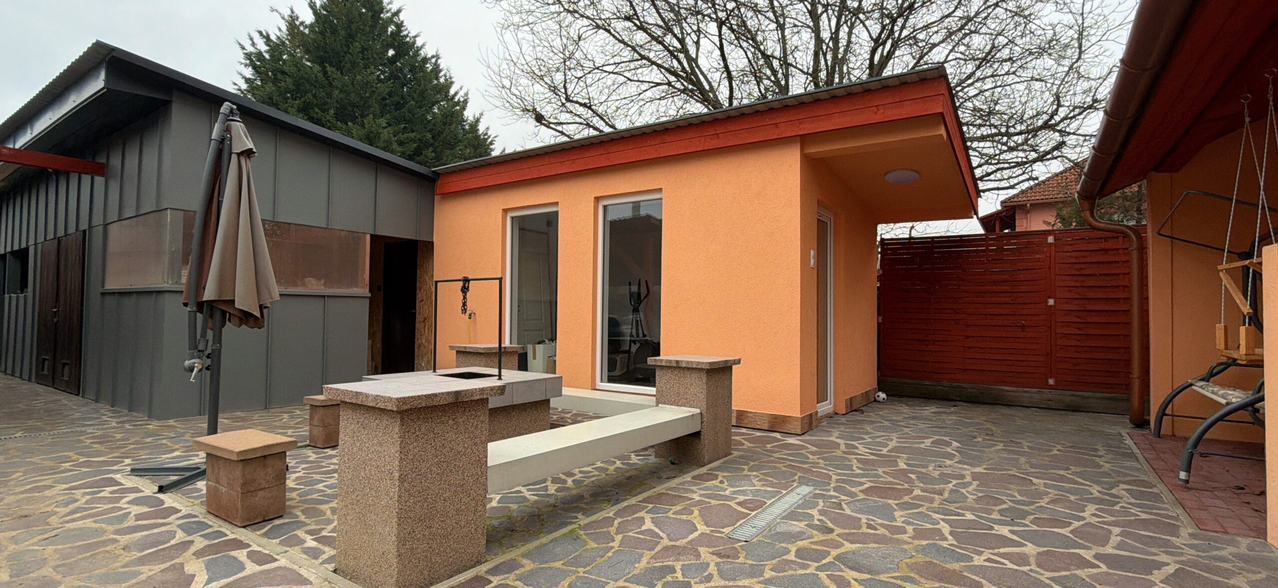 Az udvarban külön bejárattal egy 12 m²-es, hőszigetelt tároló kapott helyet, amely irodának, műhelynek vagy hobbihelyiségnek is ideális.