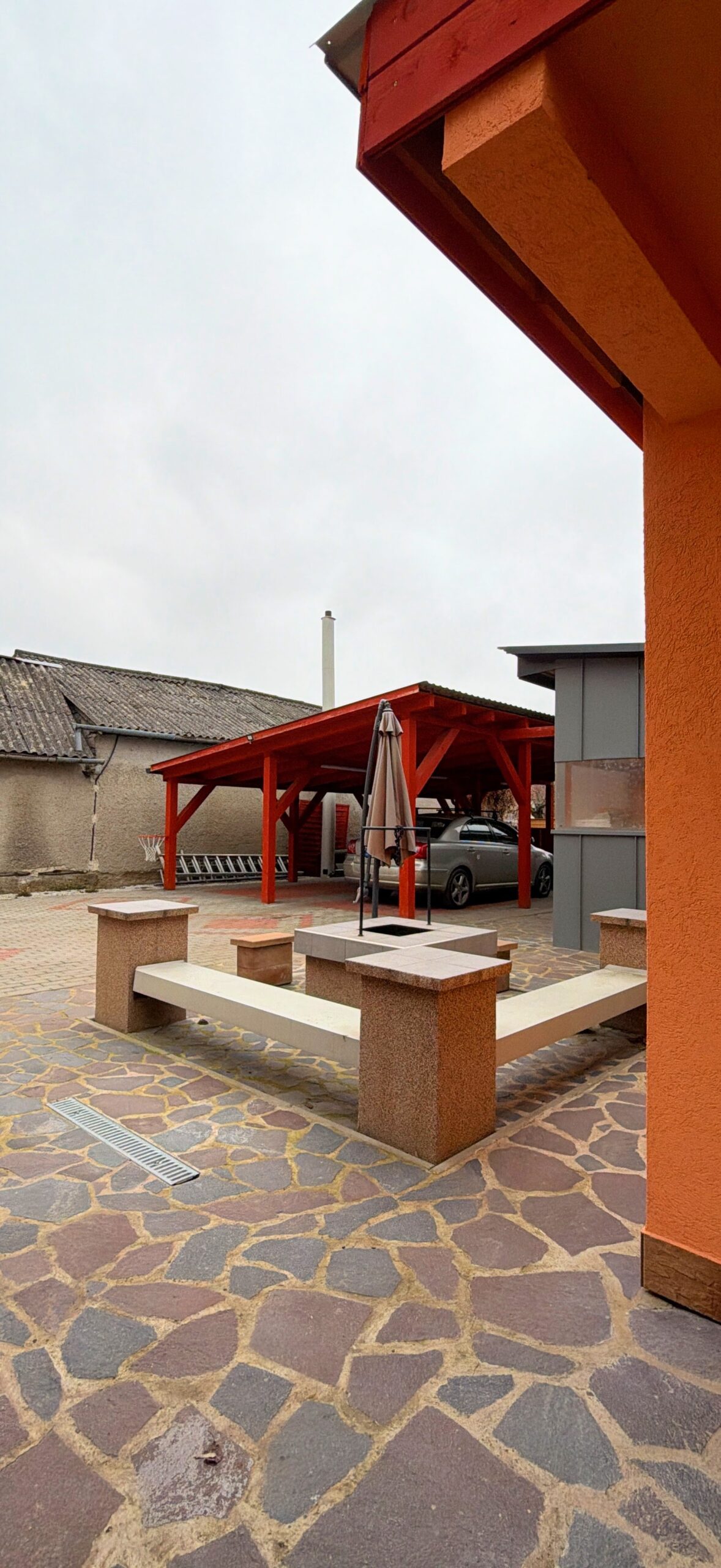 A cca. 960m2-s telek részben térkövezett, igényes bográcsozóval kialakított.