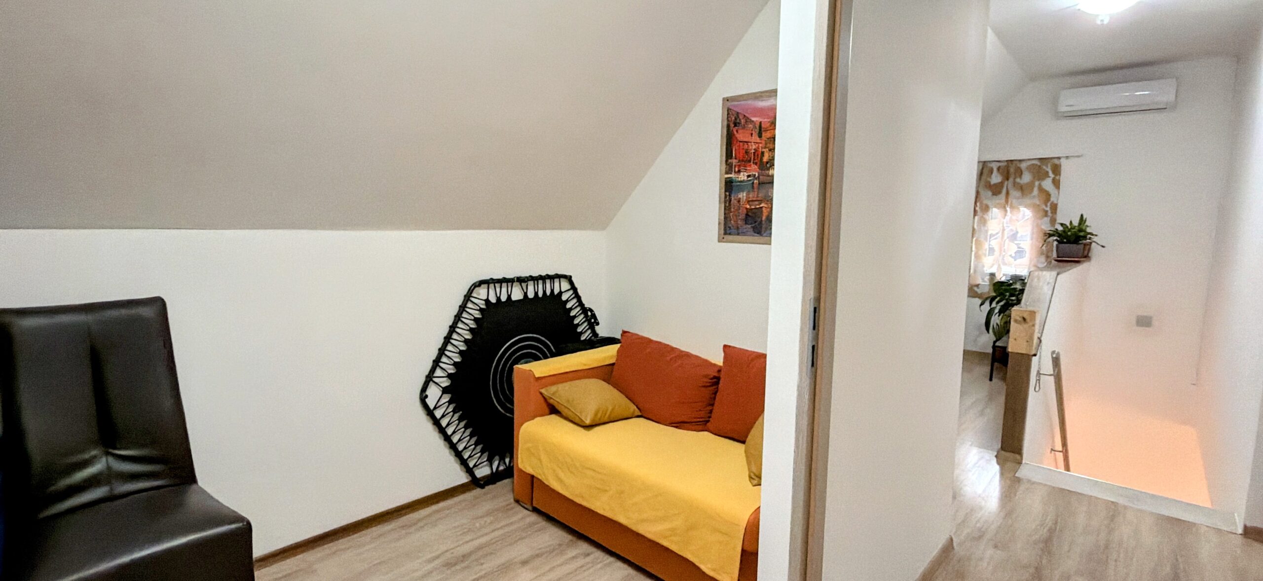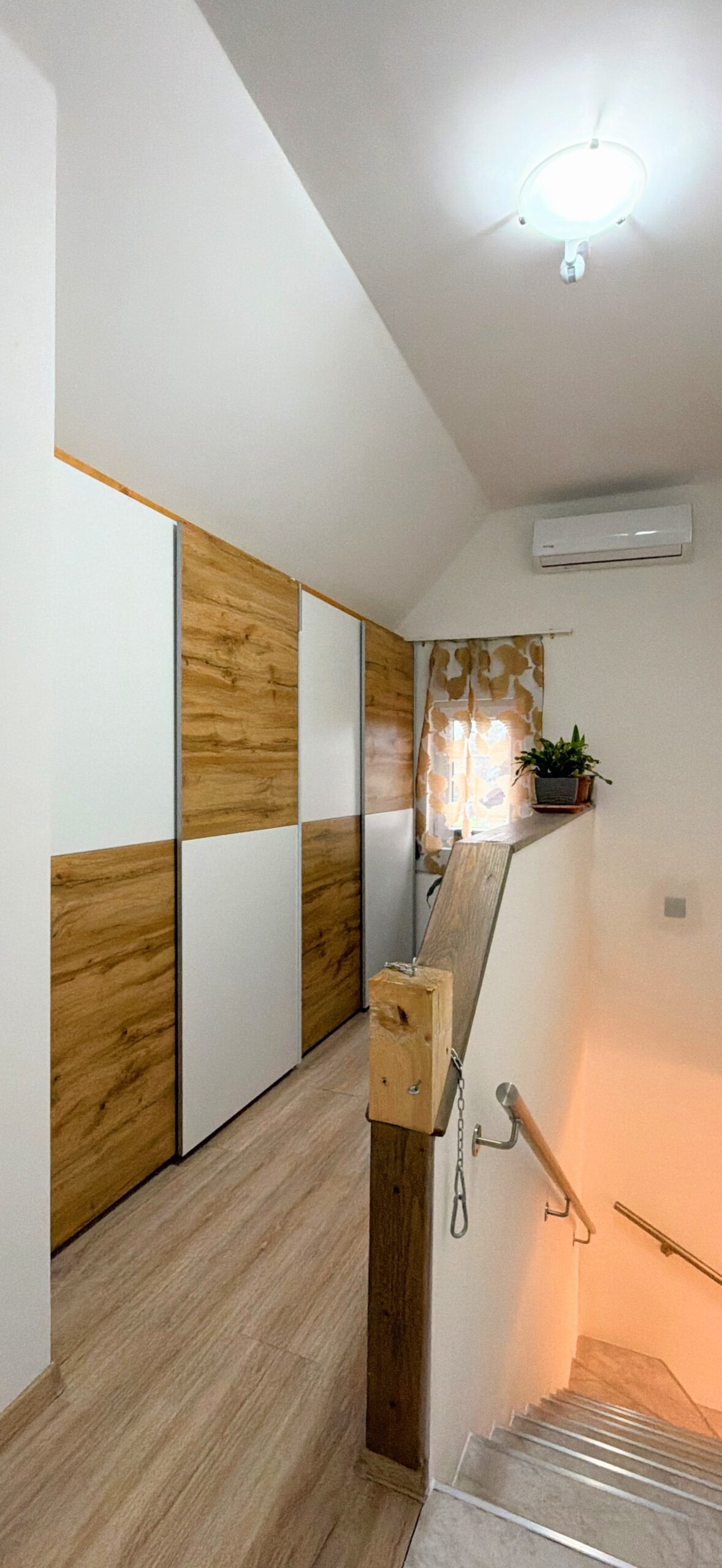 Az emeleten két egész és egy fél szoba, továbbá toalett, kézmosó, dupla beépített gardrób és erkély biztosítja a kényelmet.
