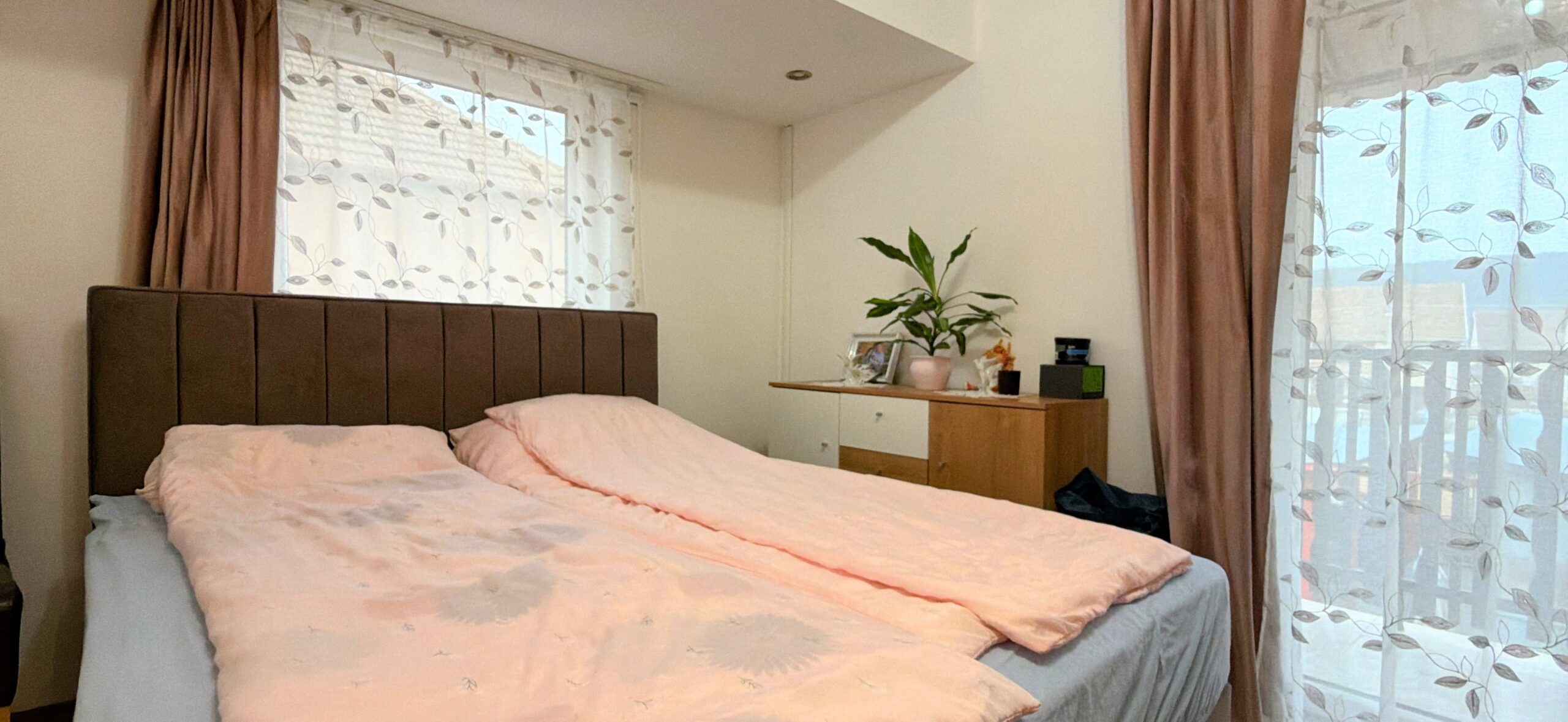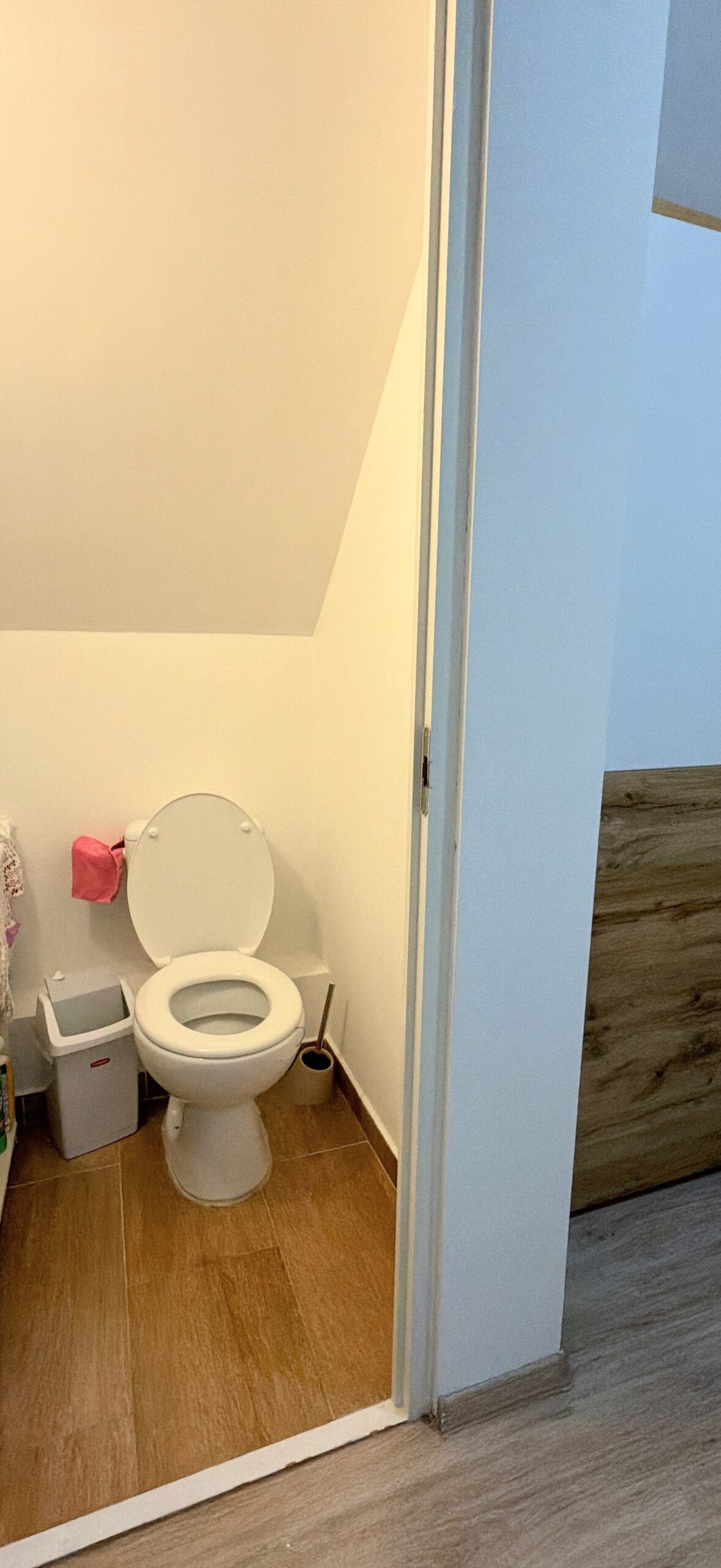 Im Obergeschoss gibt es zweieinhalb Zimmer, außerdem eine Toilette, ein Handbecken, einen doppelten eingebauten Kleiderschrank und einen Balkon.