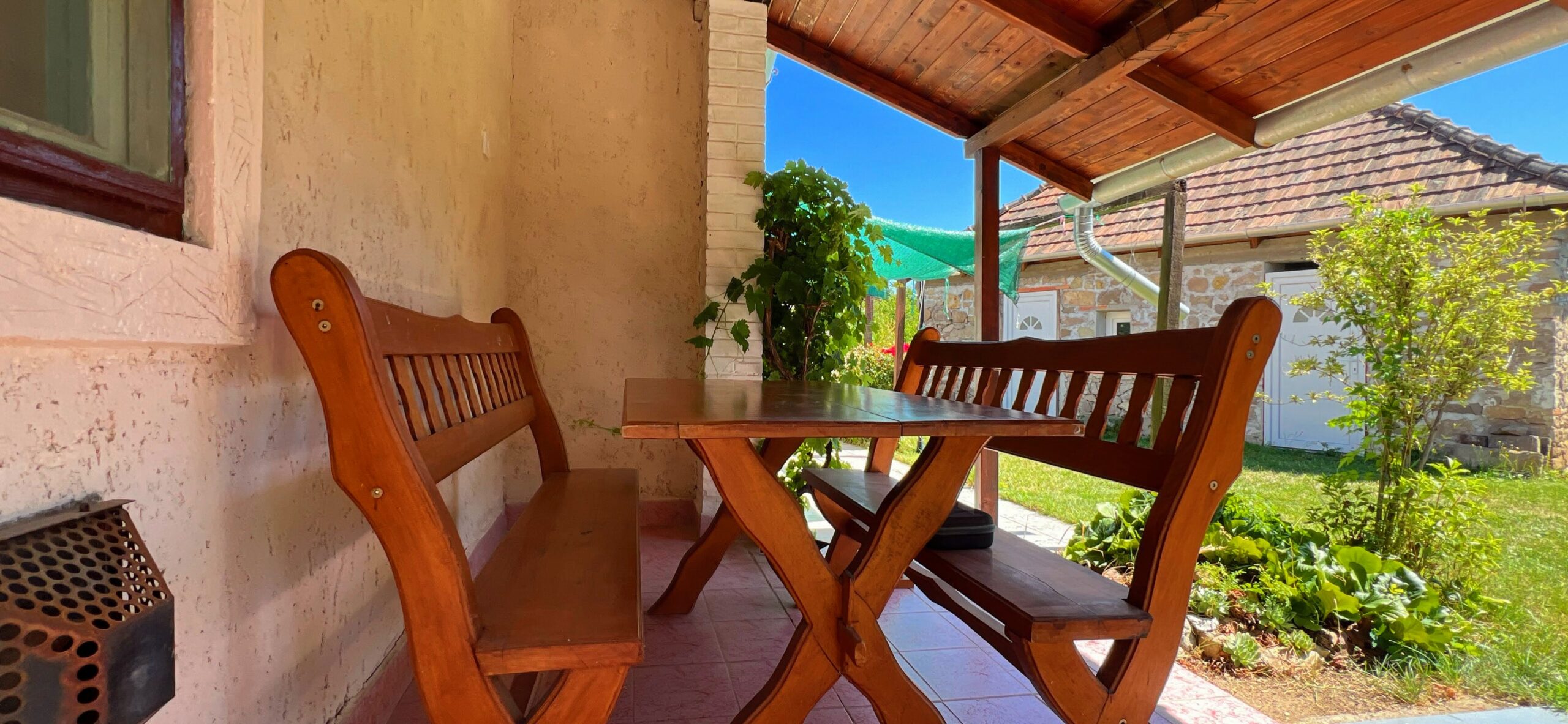 A családiház kertfelőli tornácos részén kisebb pihenőterasz van kialakítva.