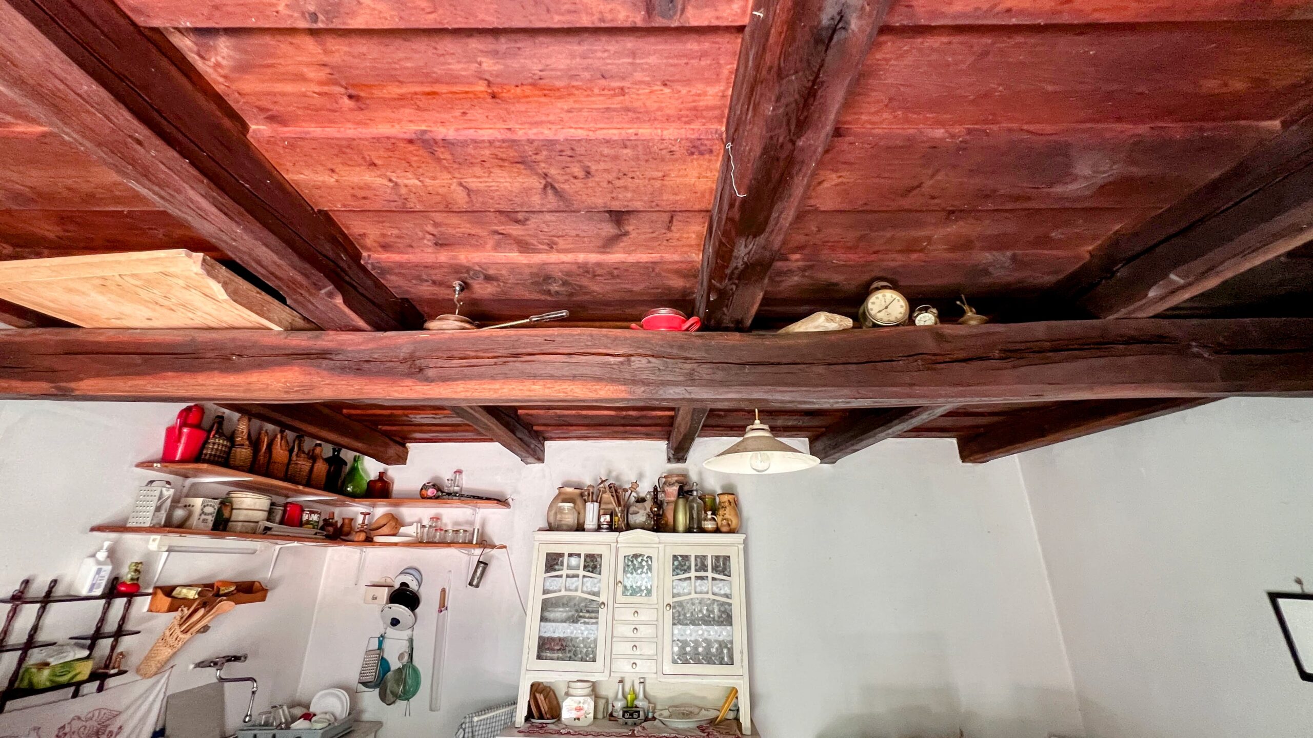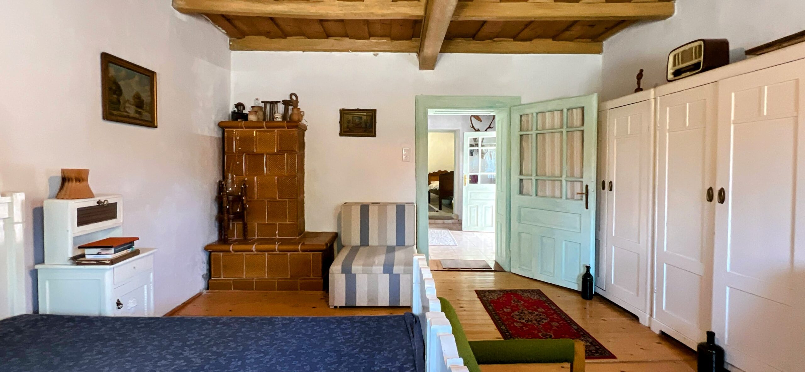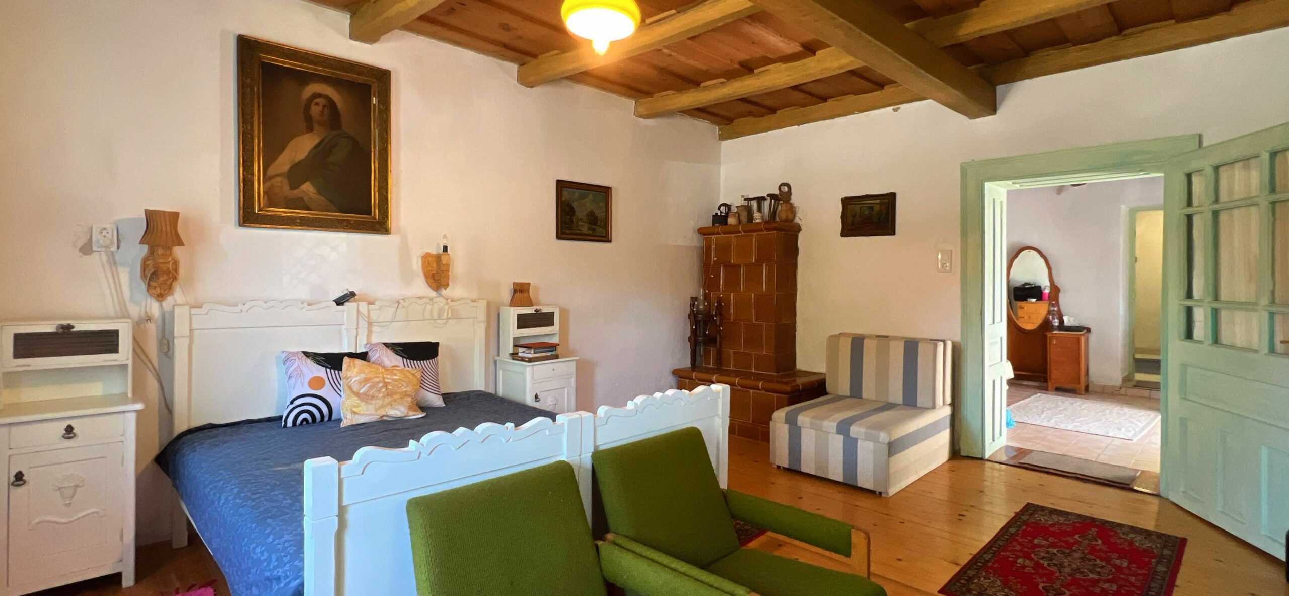 A szobák mennyezete rusztikus fa kazettás.