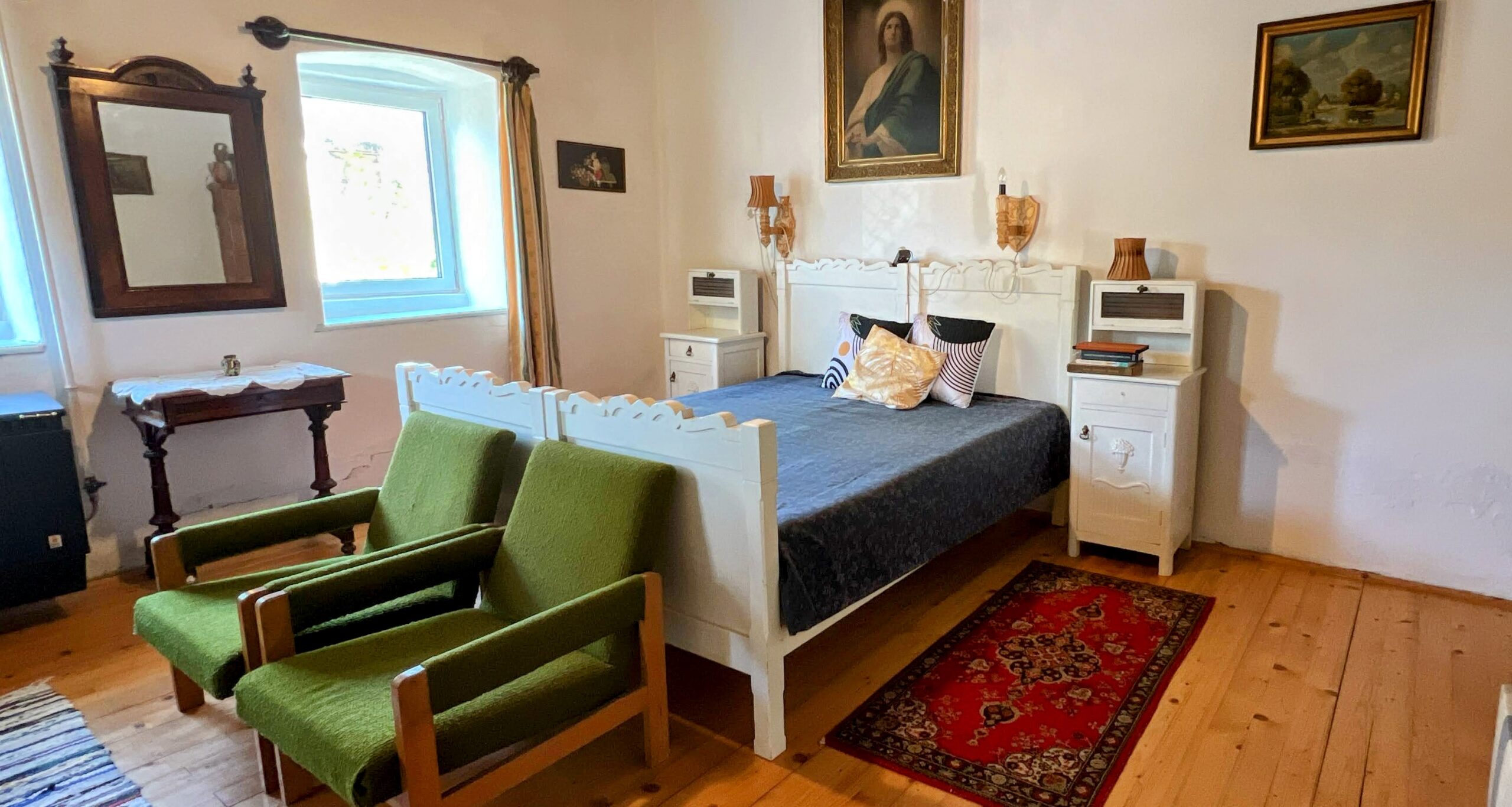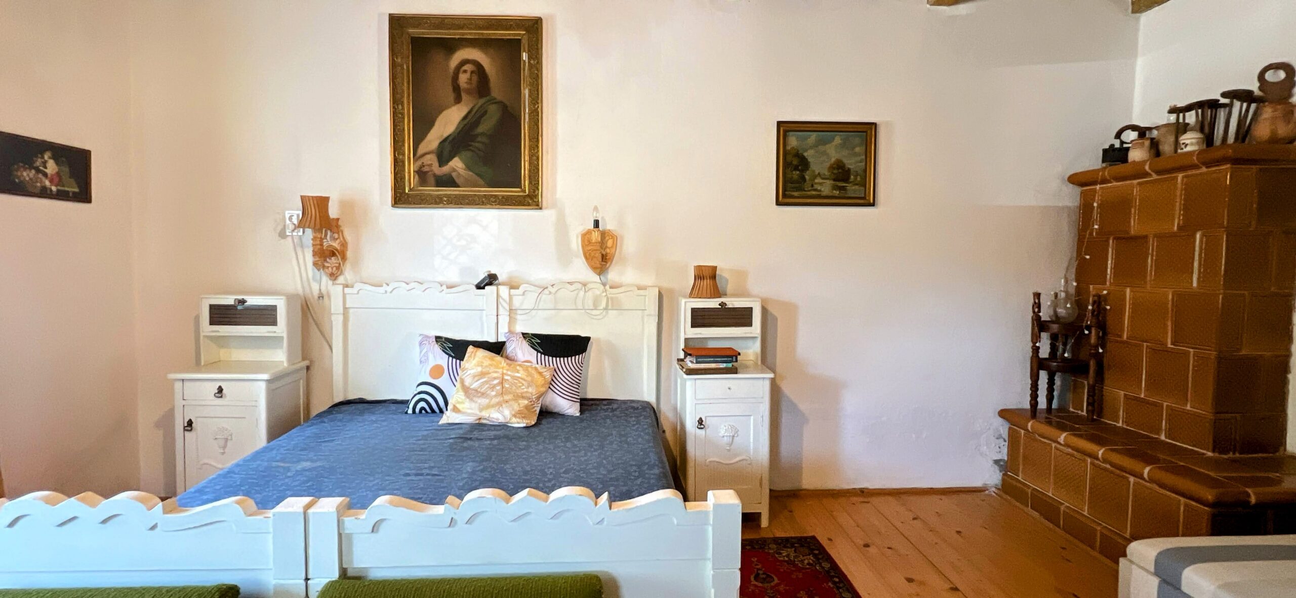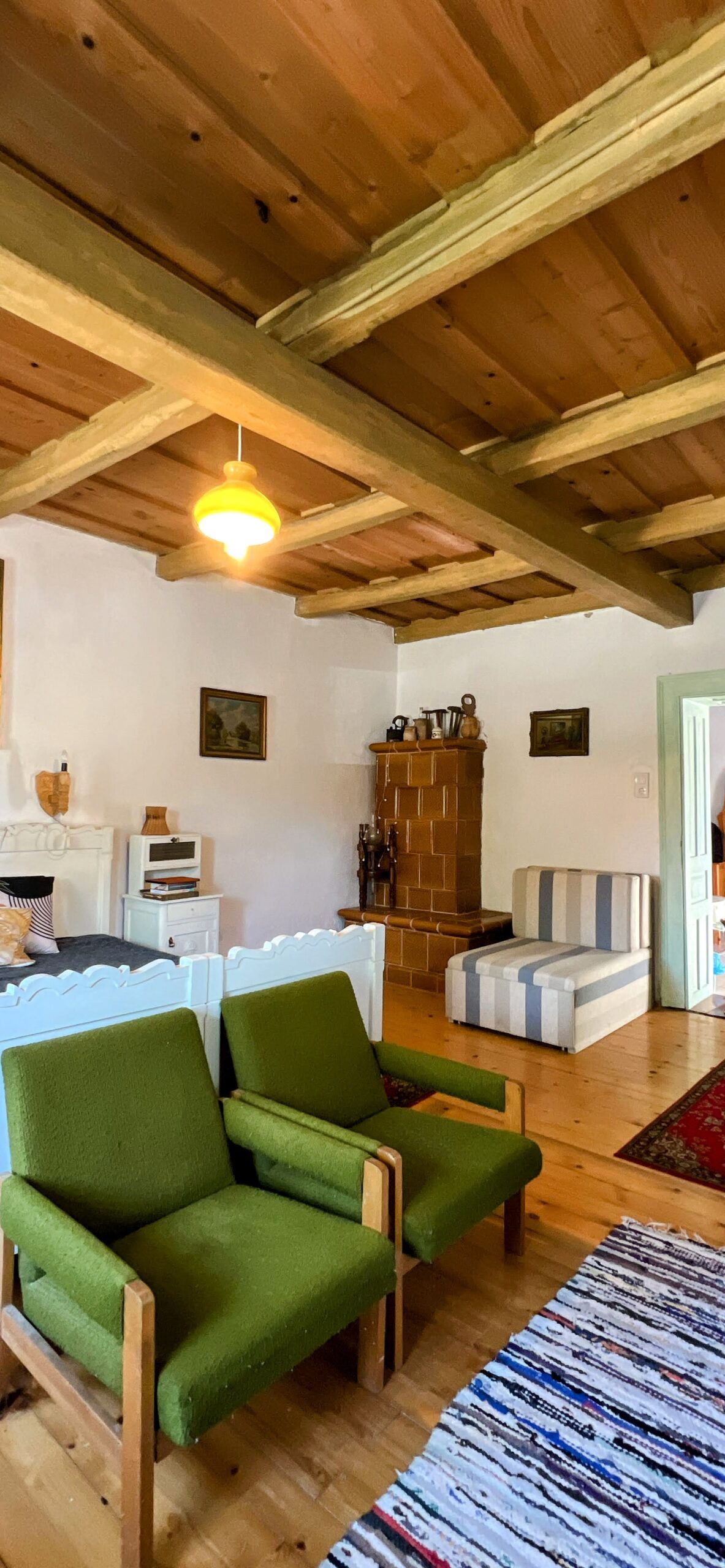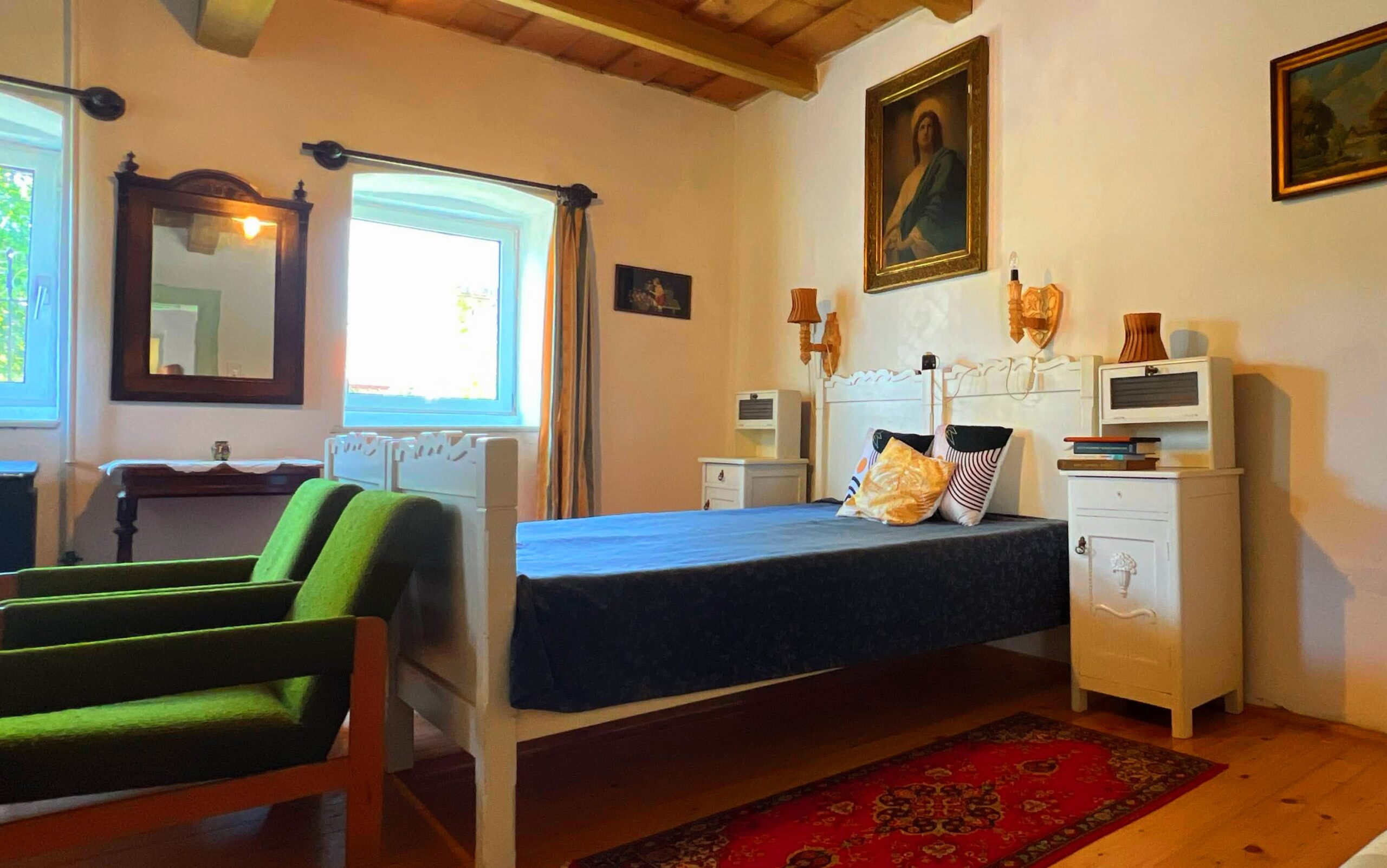 A szobák mennyezete rusztikus fa kazettás.
