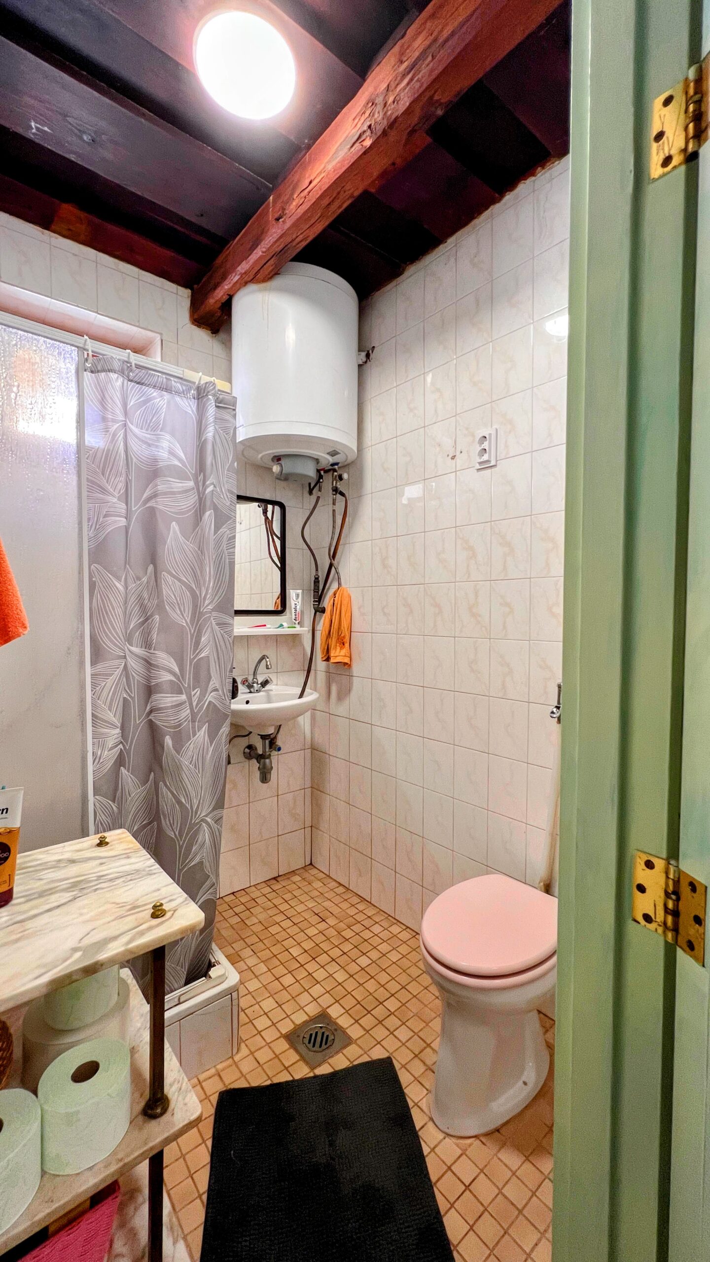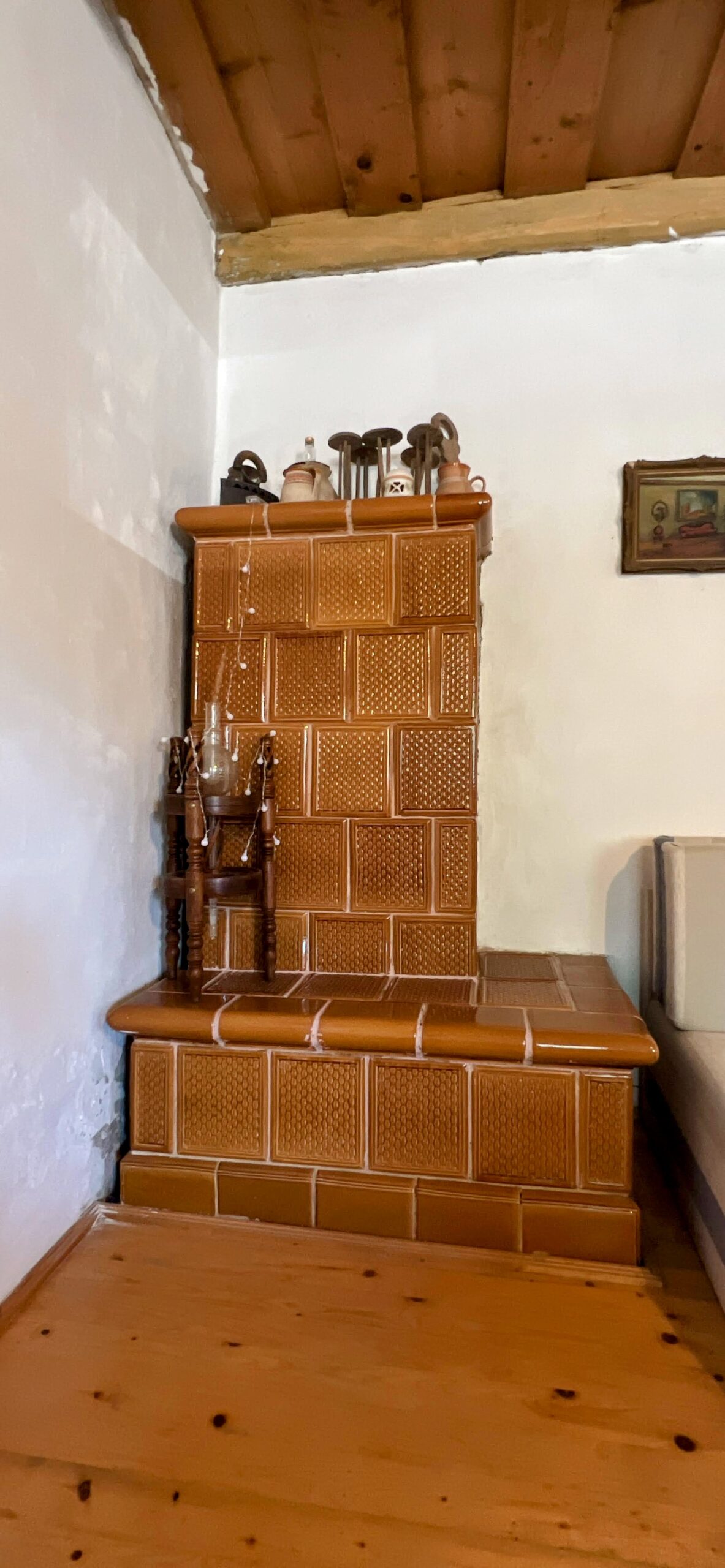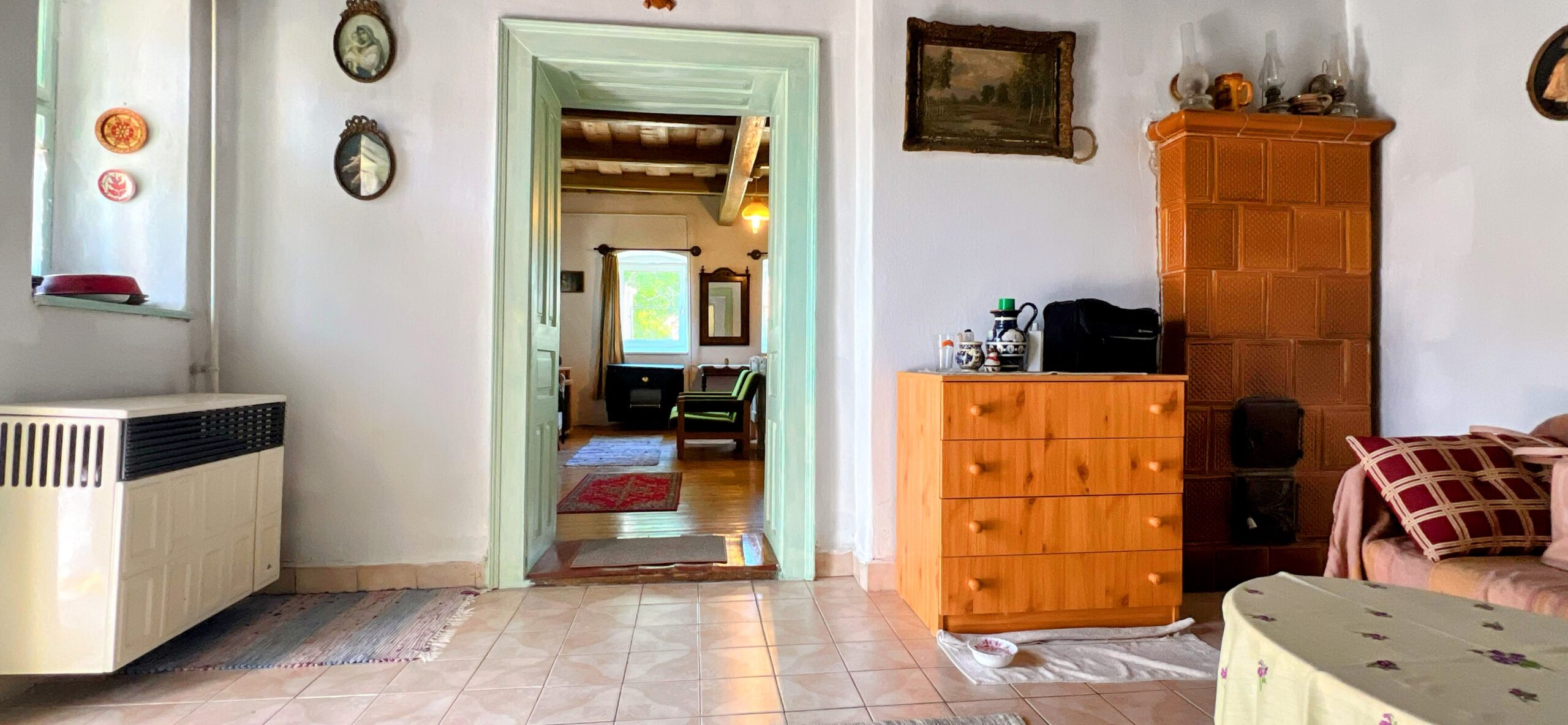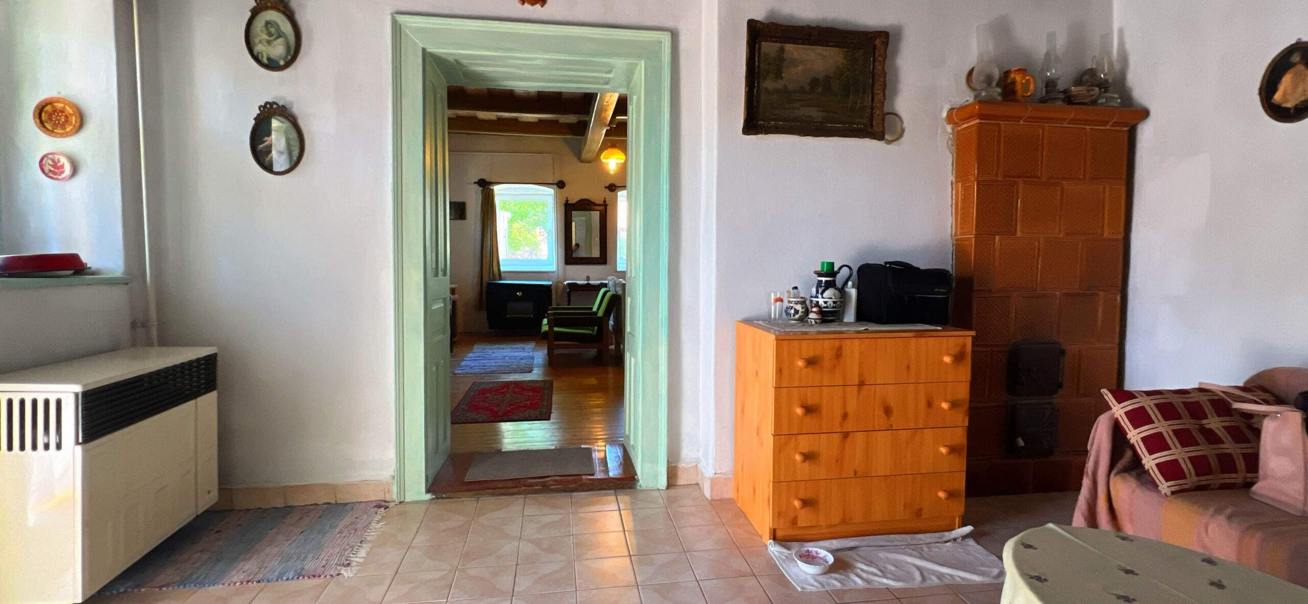 Geheizt wird über einen Gaskonvektor und einen Kachelofen.