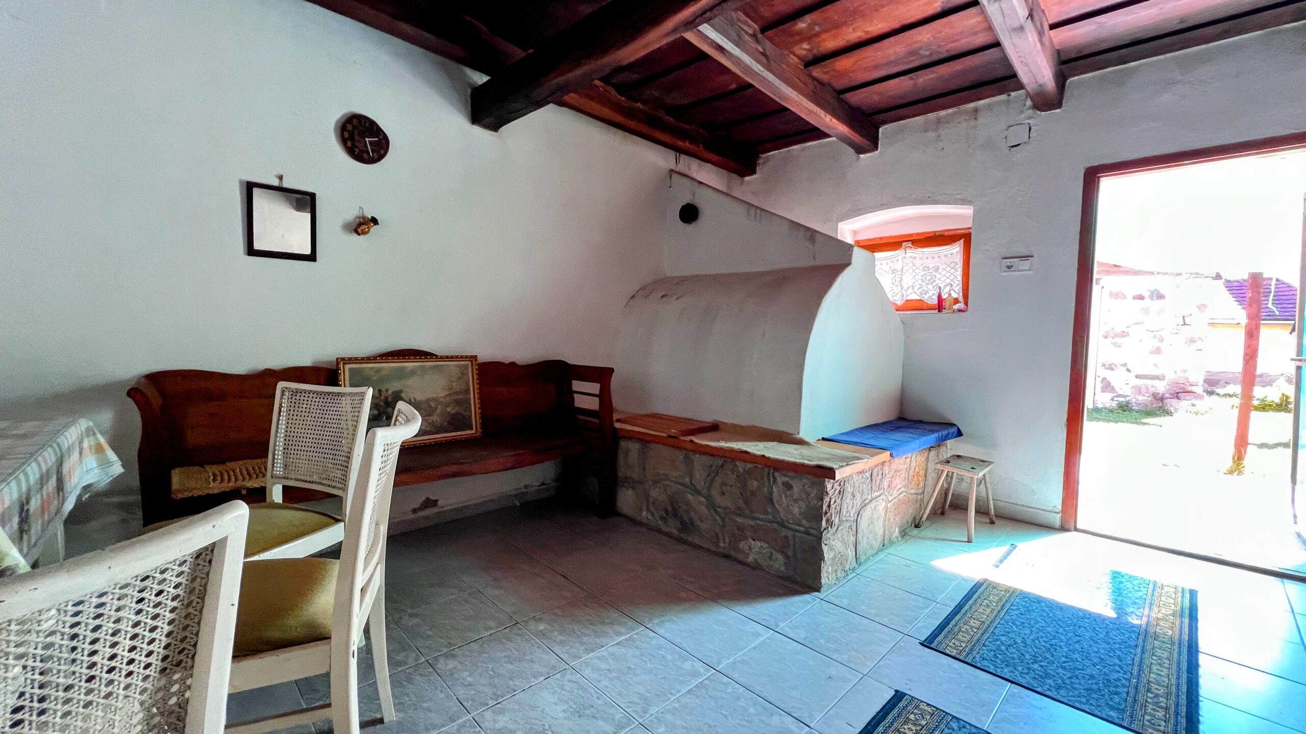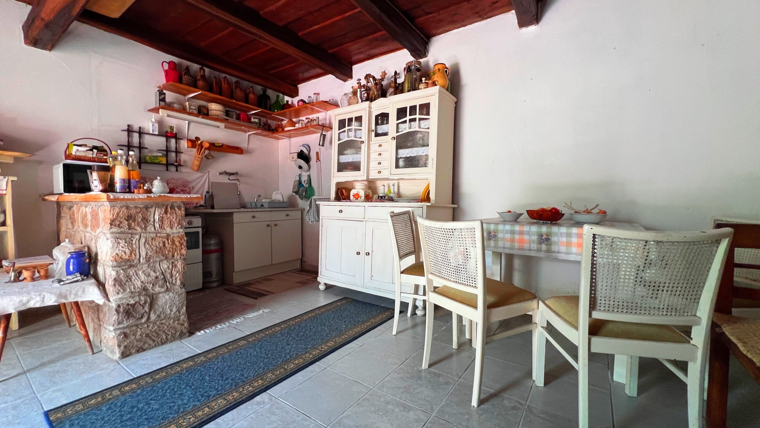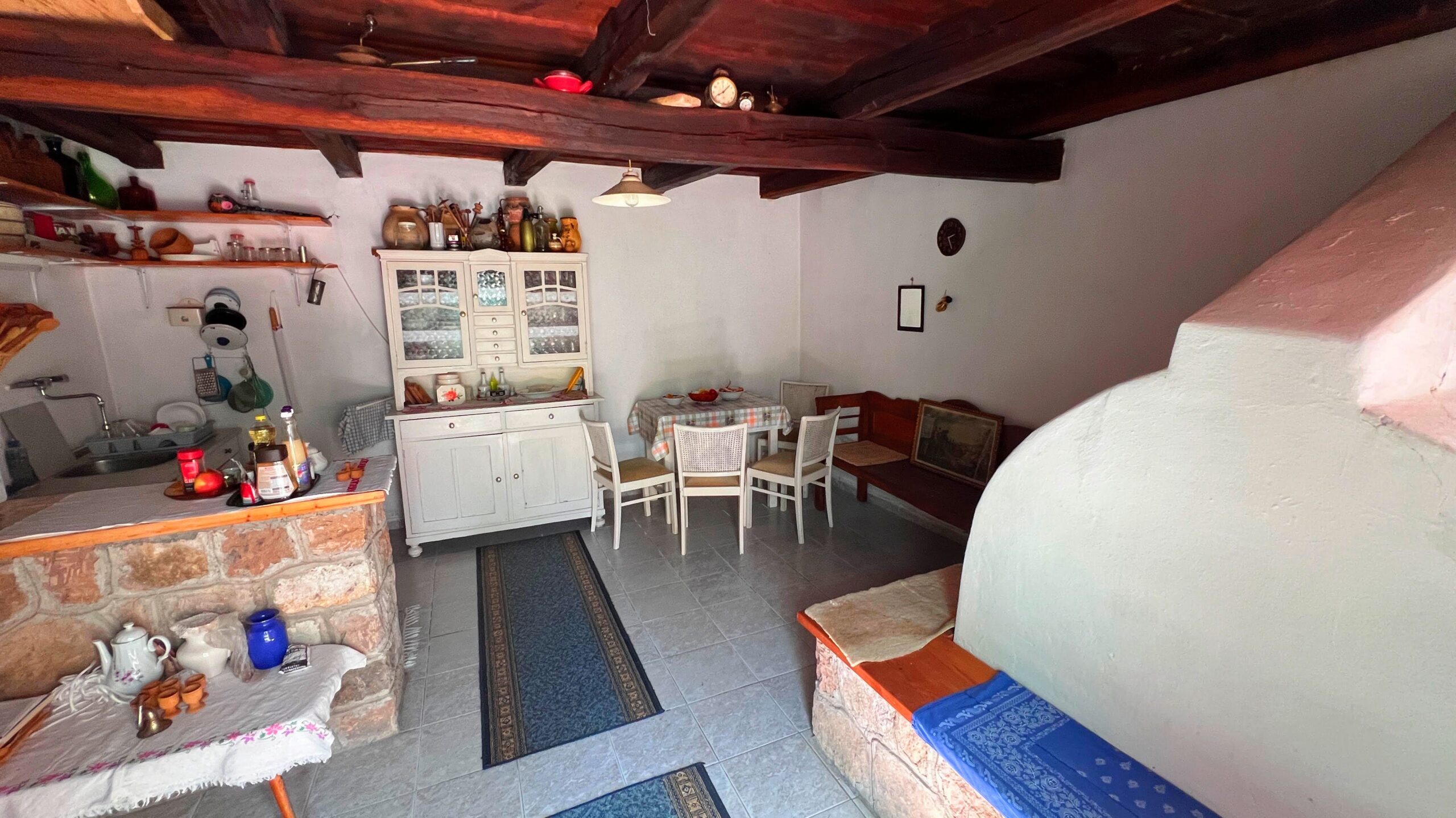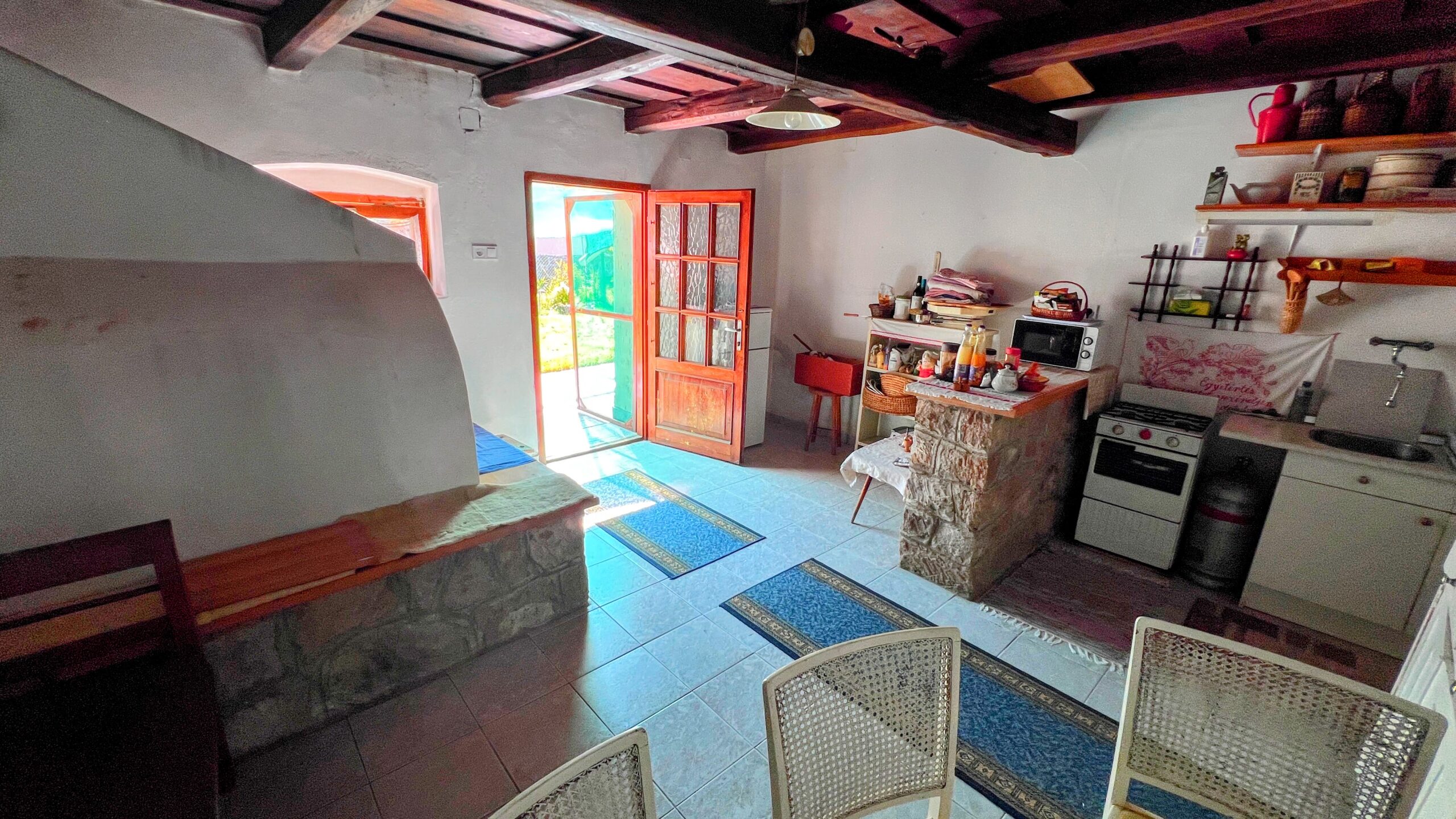 Die cca. In dem 80m2 großen Grundstück mit Steinmauern gibt es neben den 2 Zimmern einen zentralen Wohnbereich, einen Garderobenbereich und ein Badezimmer mit WC, die Küche hat einen Außeneingang, der in das Wohnhaus integriert ist, und hier wurde auch ein Holzofen eingerichtet.