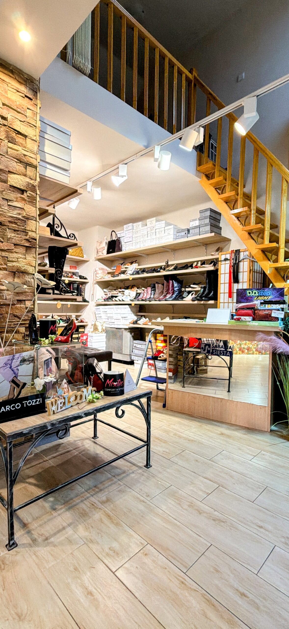 Az alsó szinten 1-1 üzlethelyiség, ezek fölött toalettekkel rendelkező galériák vannak.