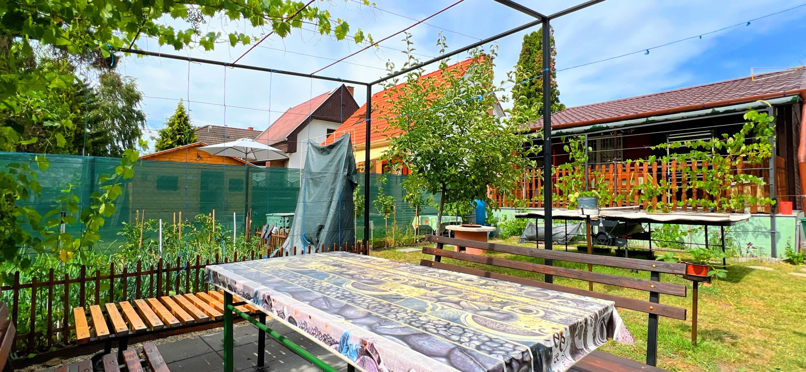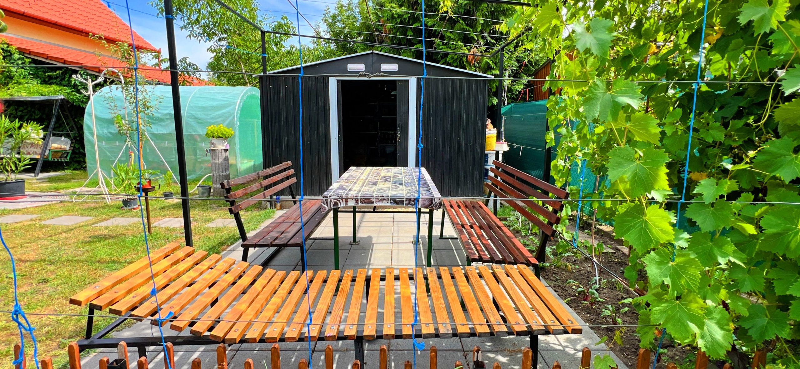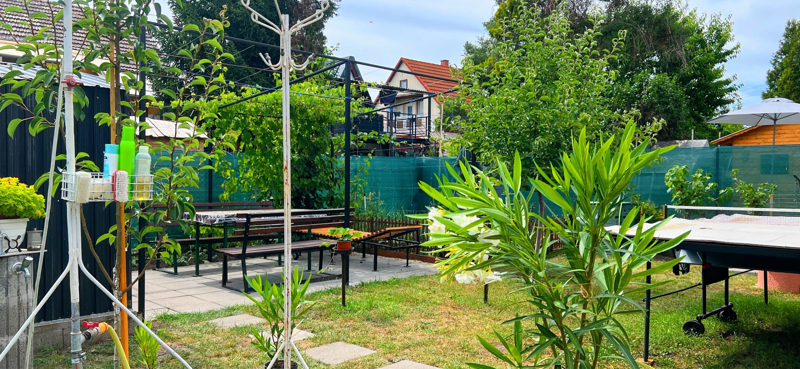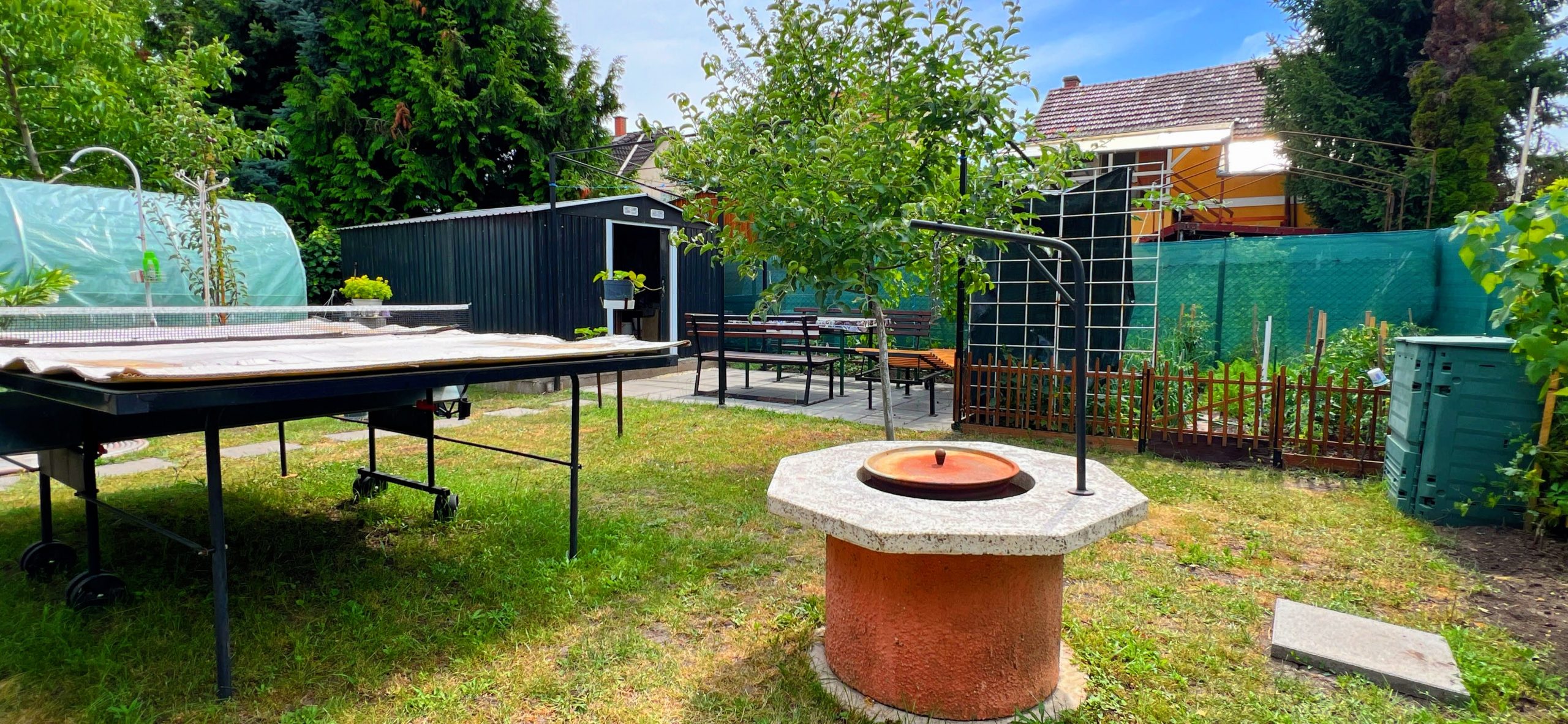 A telek cca. 280m2, ezen kerti kiülő, fémből készült tároló és bográcsozóhely van, a kert parkosított, gondozott.