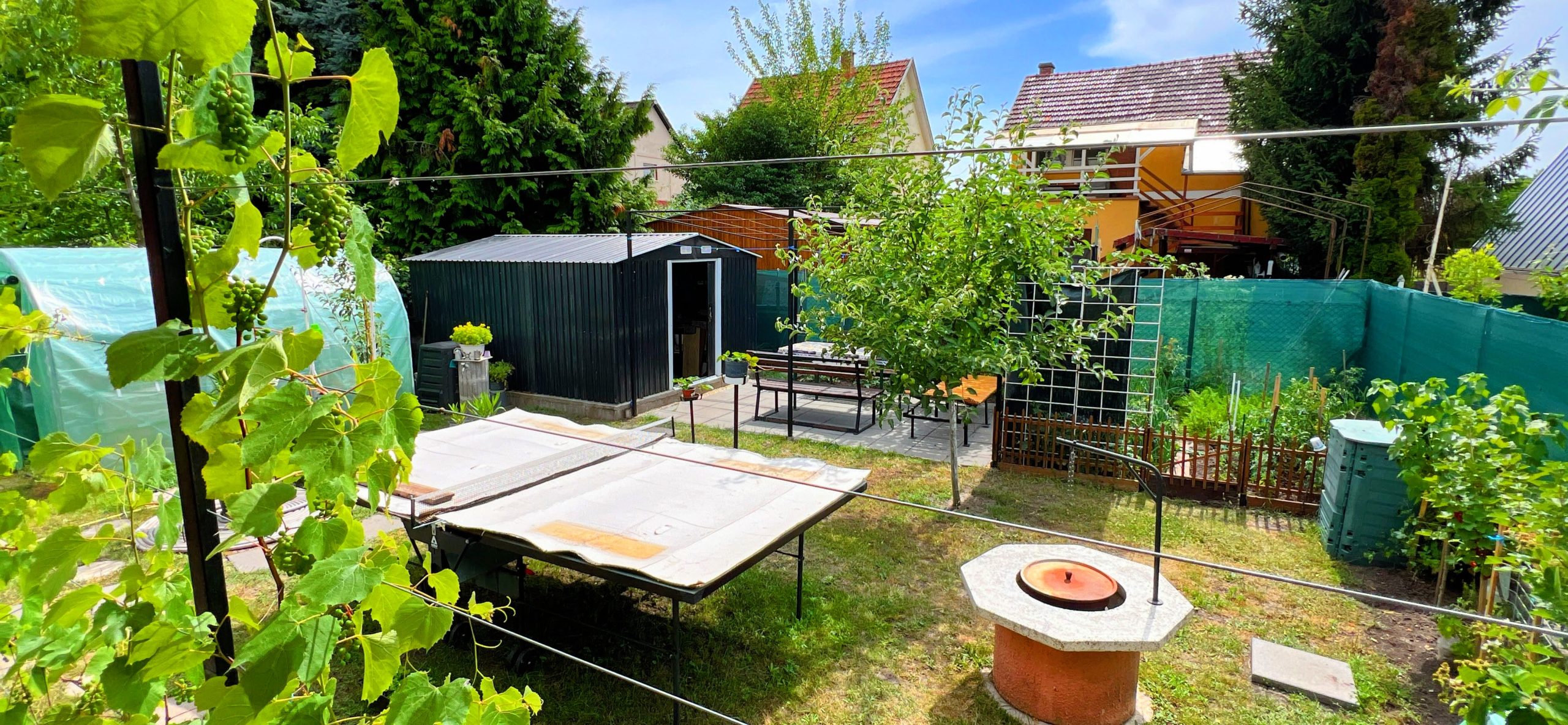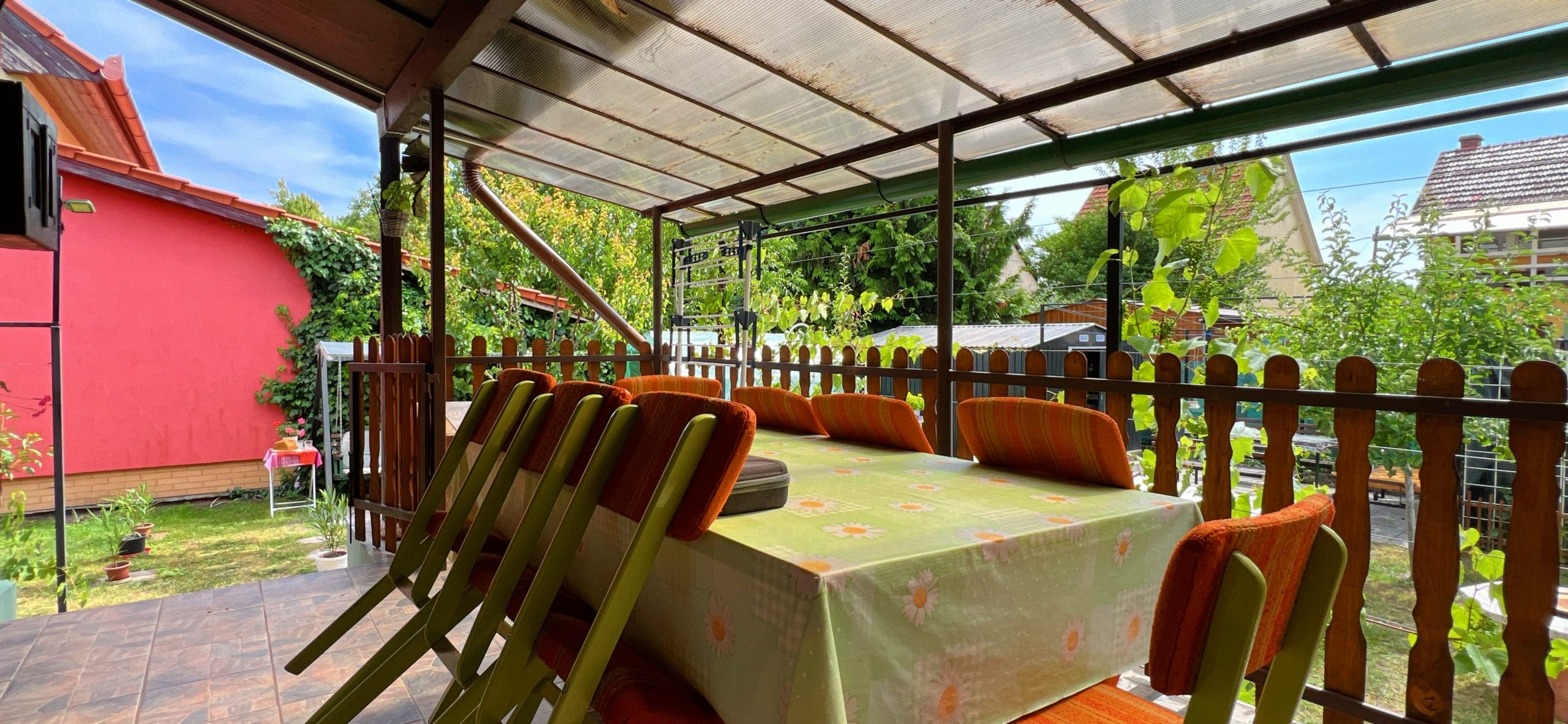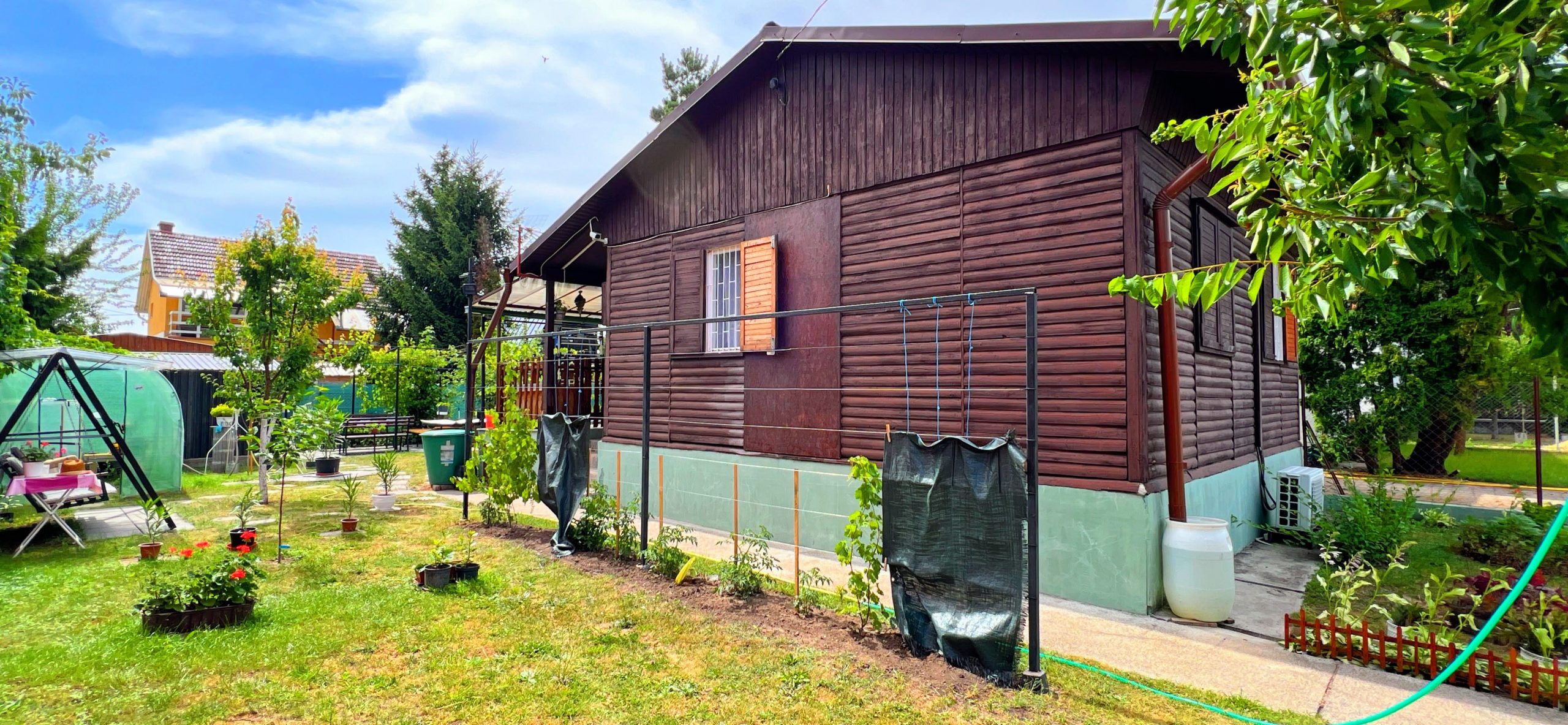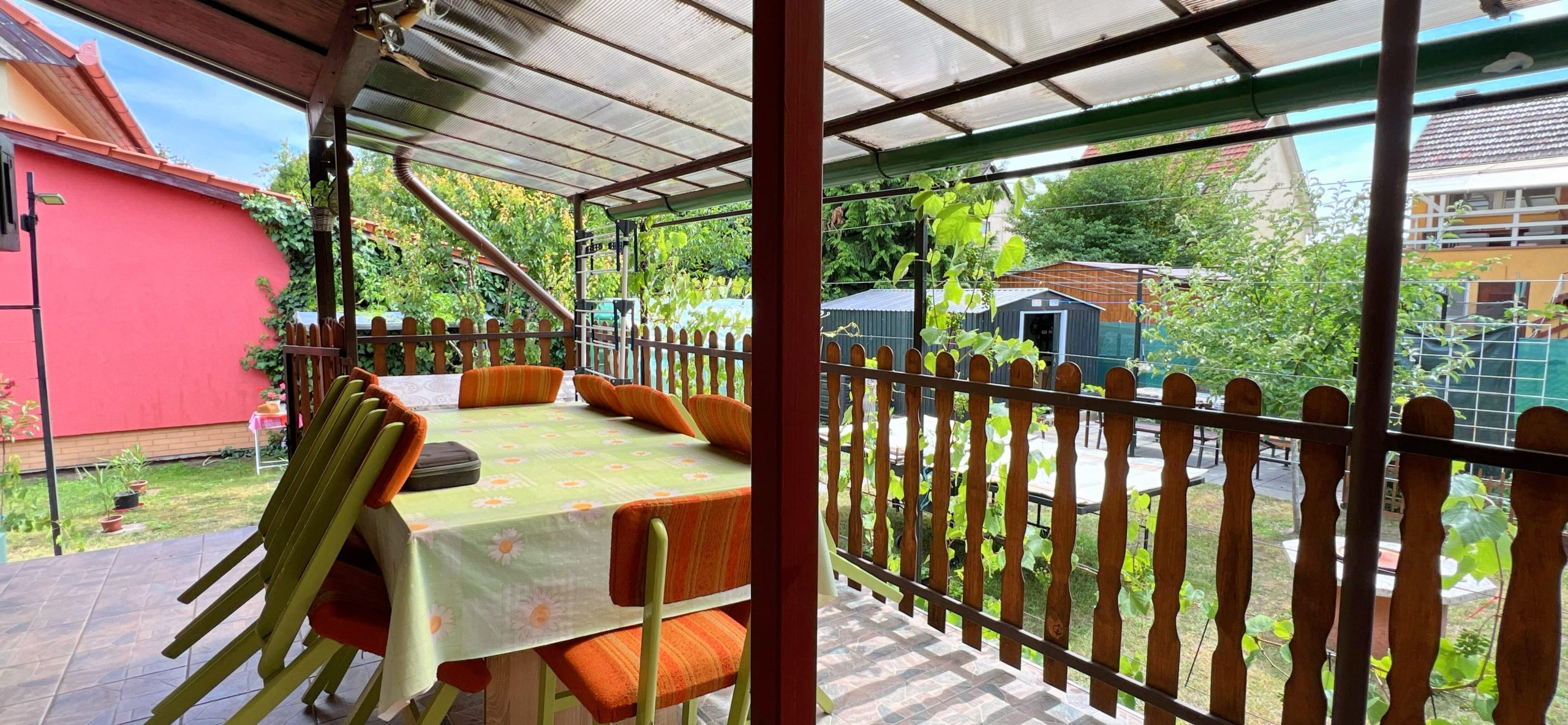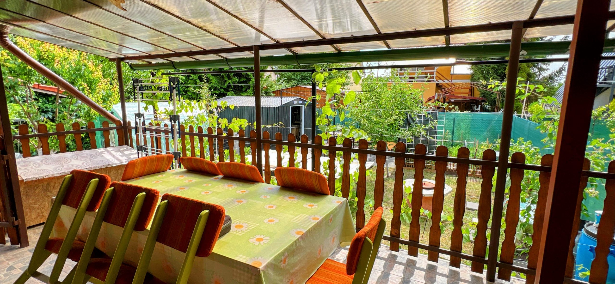 A telek cca. 280m2, ezen kerti kiülő, fémből készült tároló és bográcsozóhely van, a kert parkosított, gondozott.