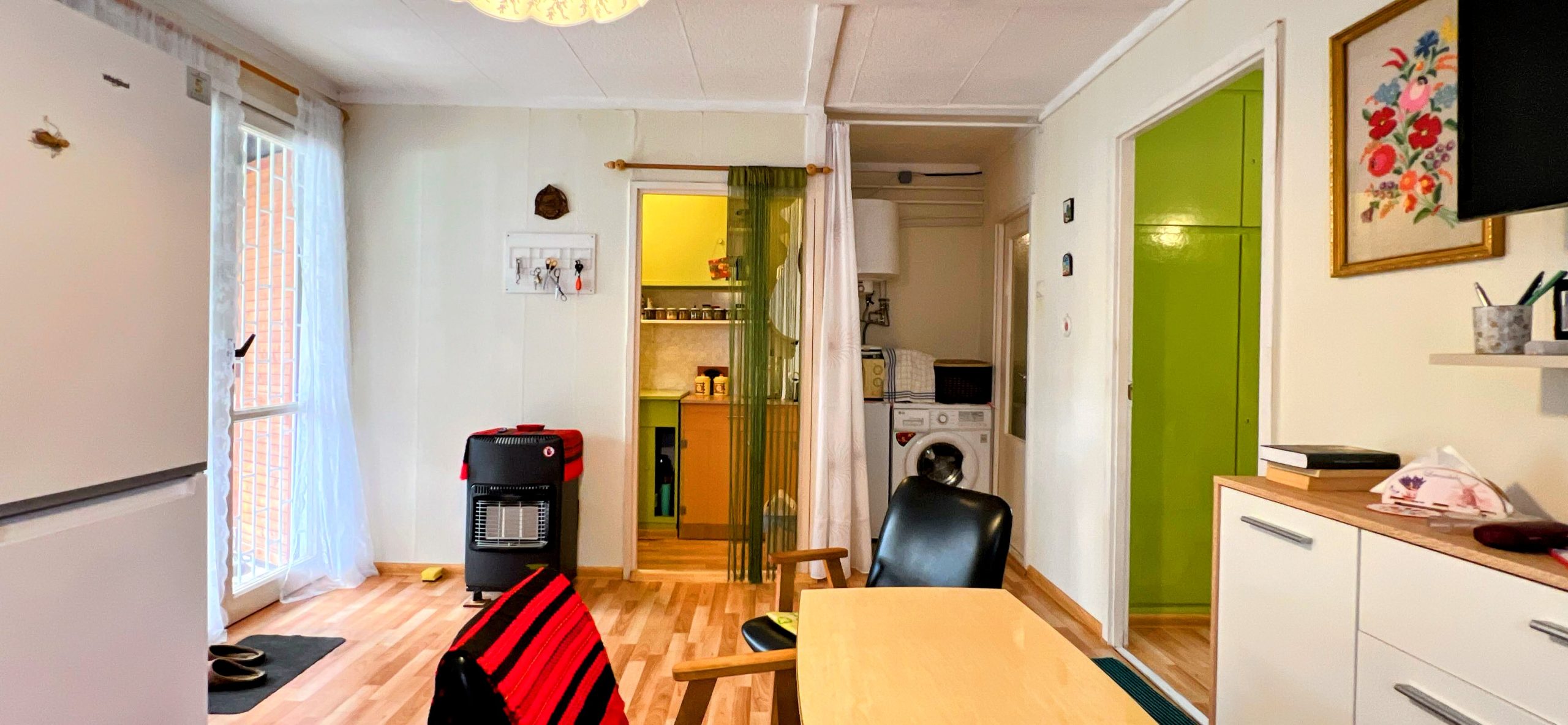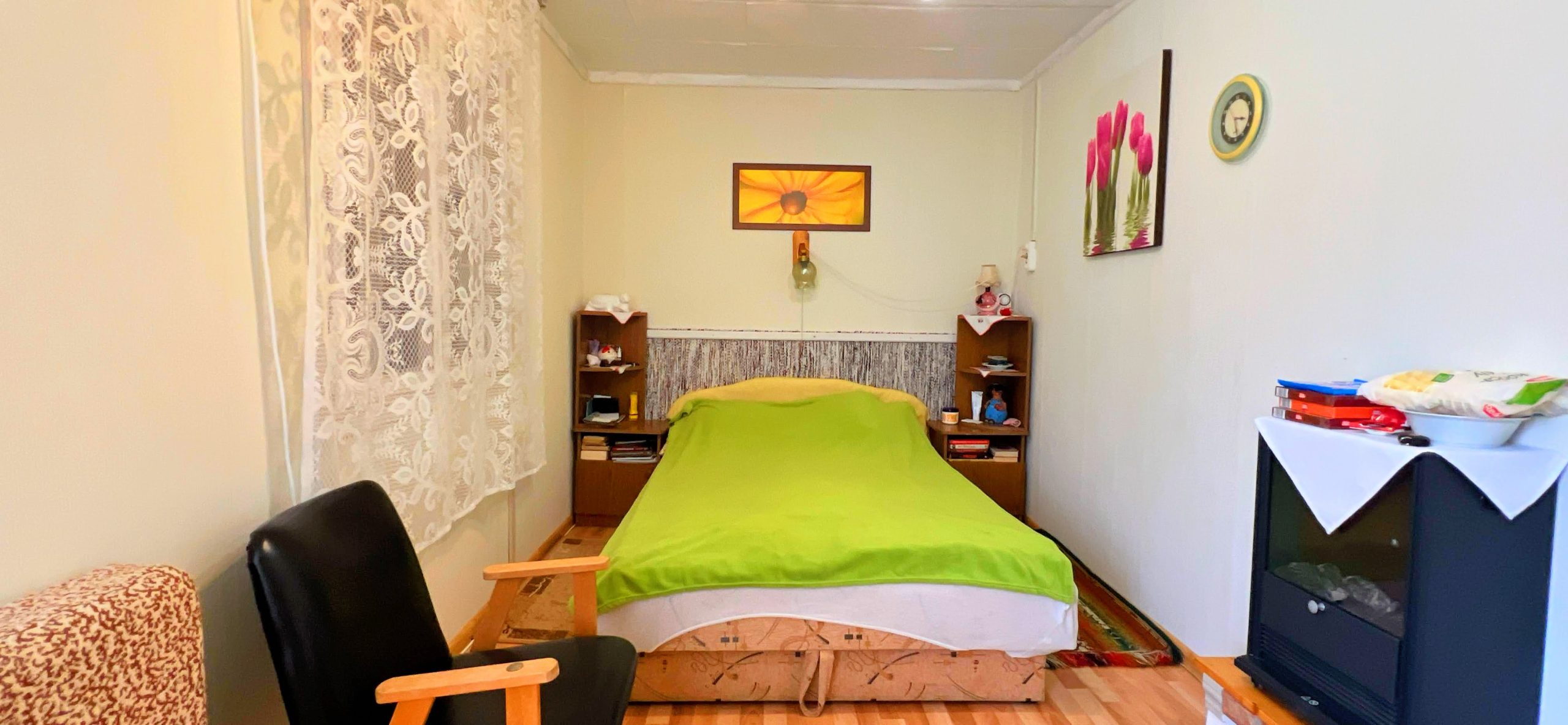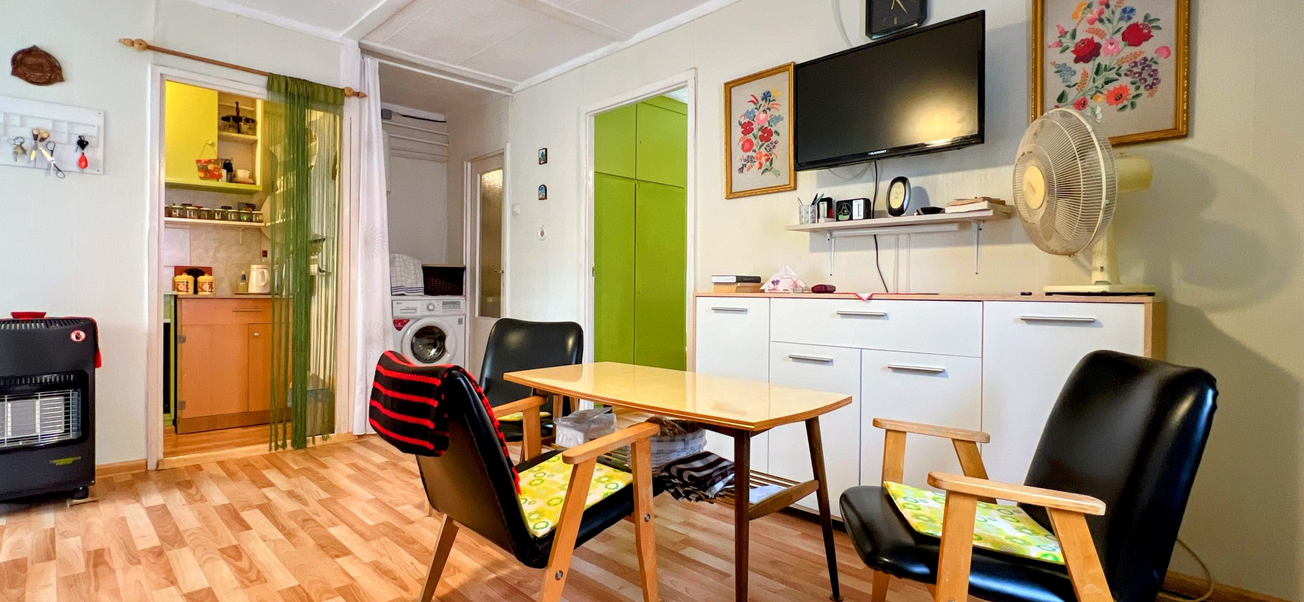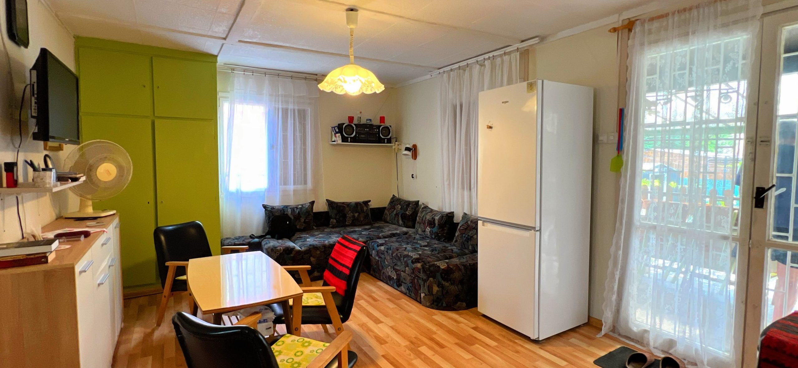 A könnyűszerkezetes, cca. 40m2-s ingatlanban nappali-étkező, hálószoba, konyha és fürdőszoba van.