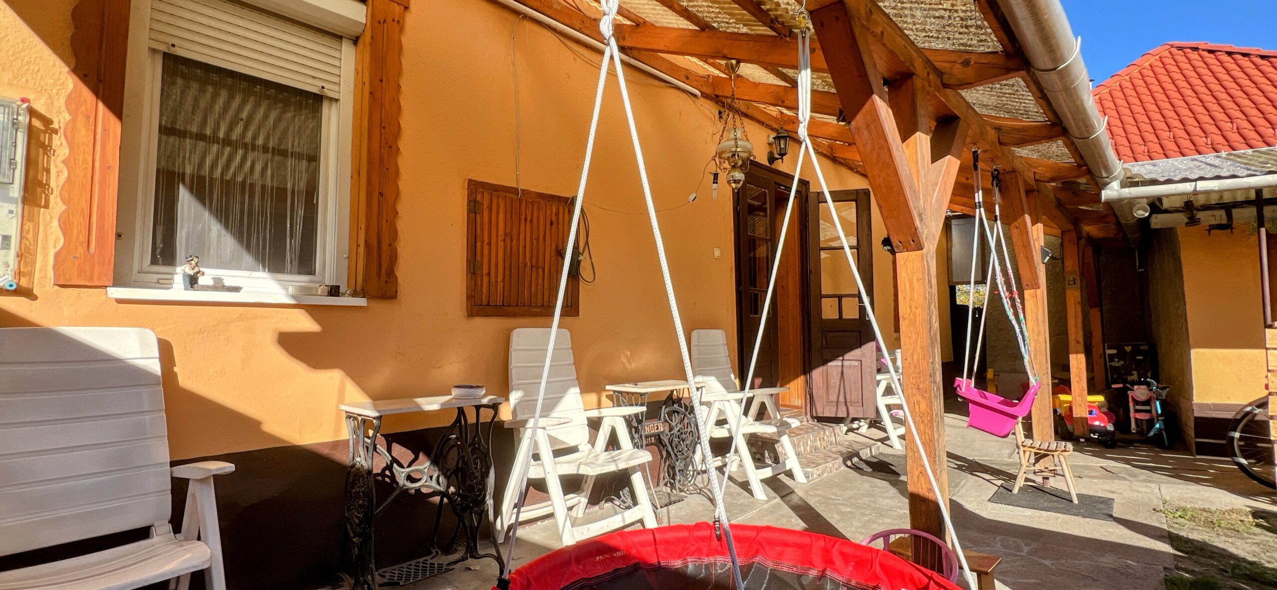 A pihenő kert cca. 250m2, itt nyárikonyha, garázs és fatároló lett kialakítva.
