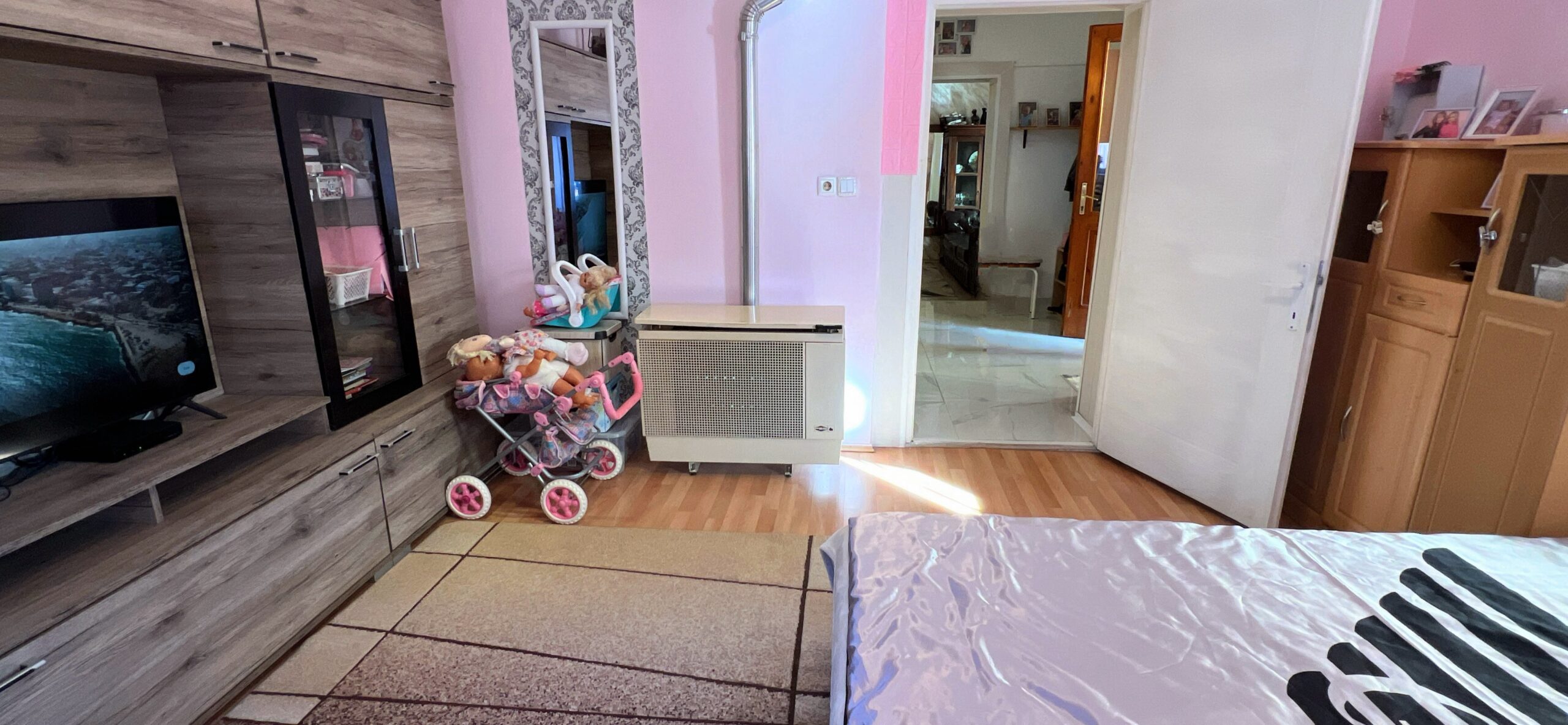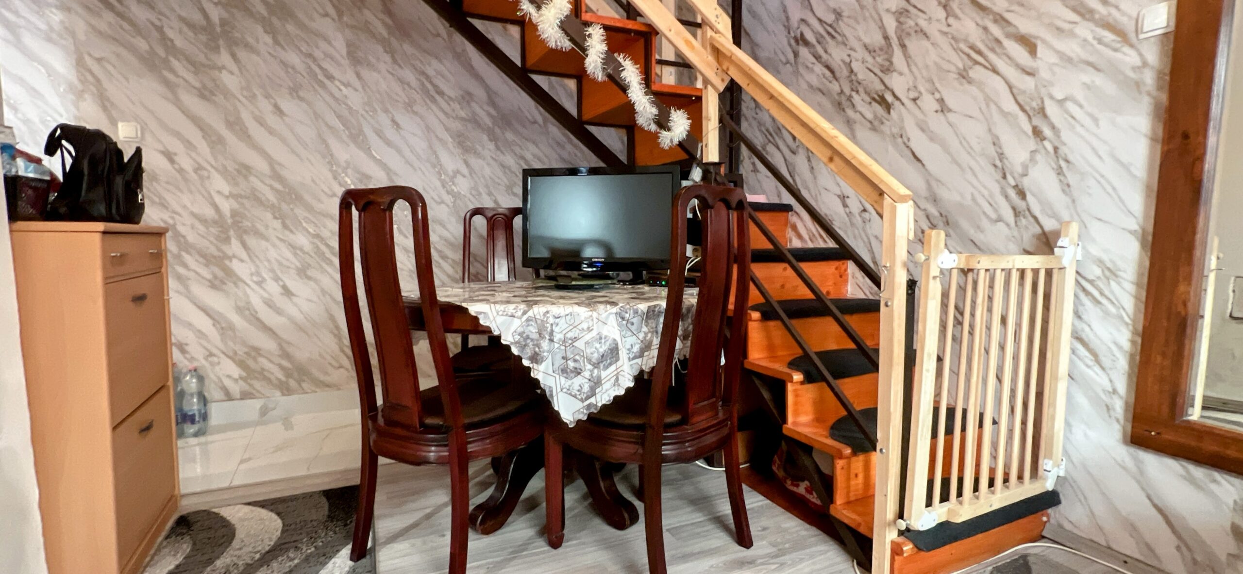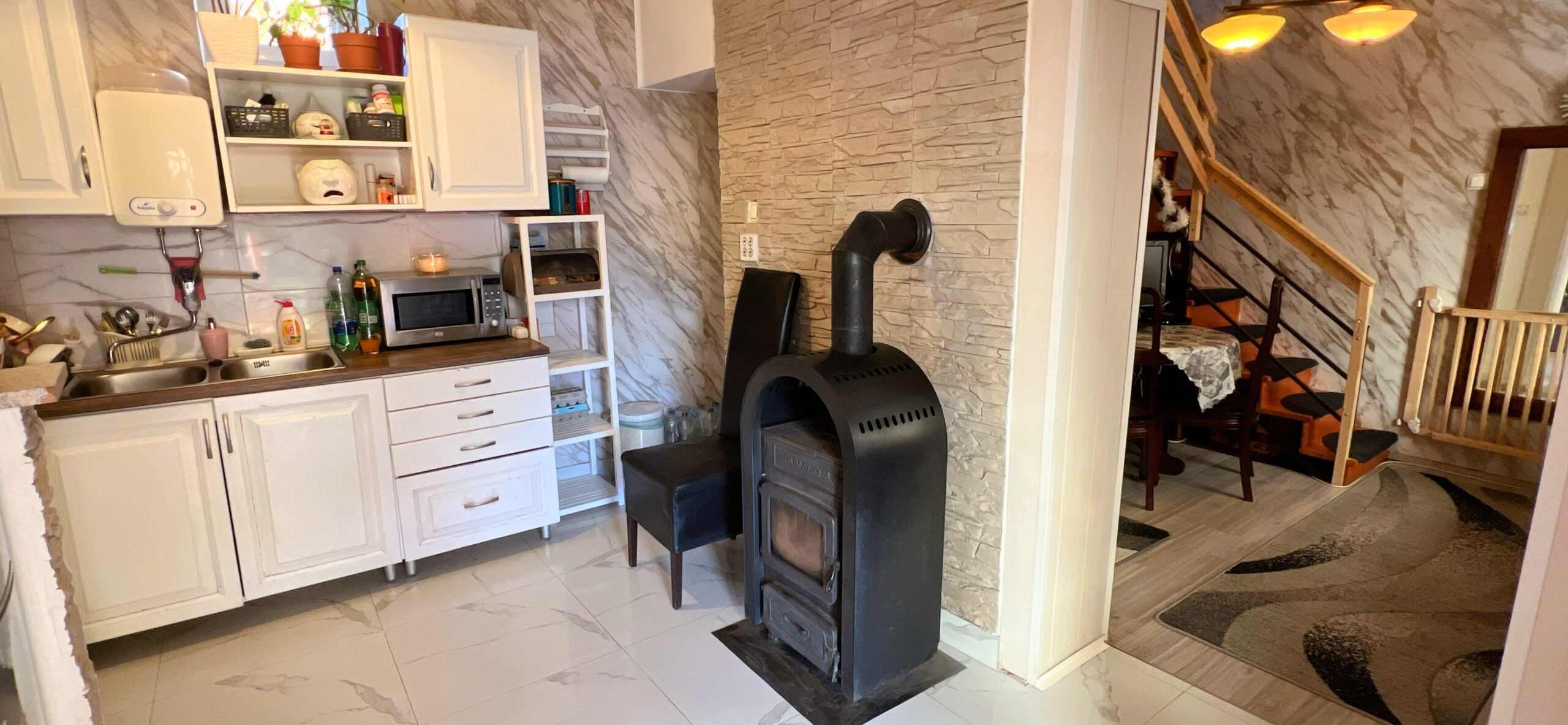 Die cca. Das 90m2 große Anwesen verfügt über ein Wohnzimmer, ein Esszimmer, eine Küche und ein Badezimmer mit WC im Erdgeschoss.