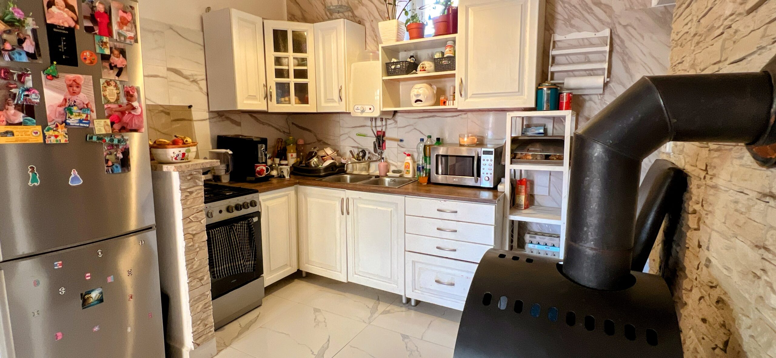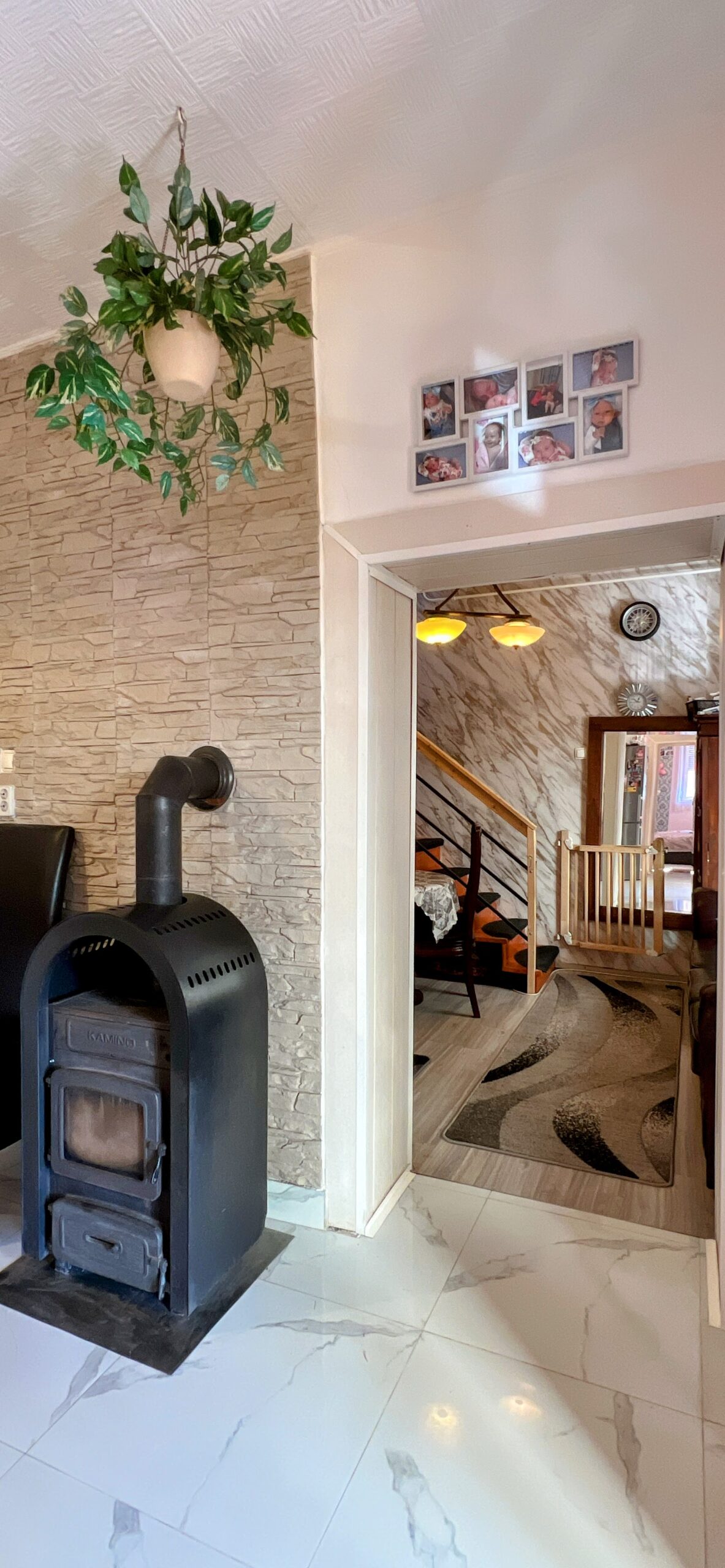 A családiház fűtése gázkonvektorral és fatüzelésű kandallóval van megoldva.