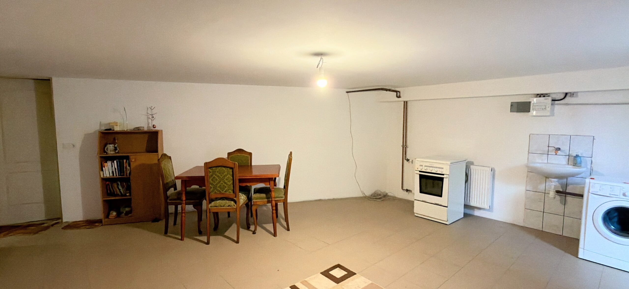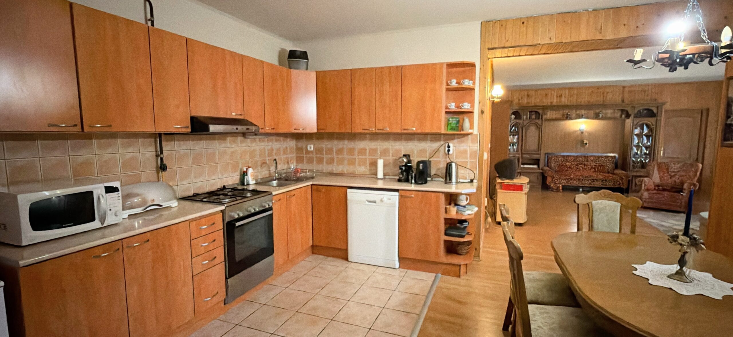 A ház teljesen alápincézett, 70%-ban burkolva (padlólap + oldalfalon gipszkarton), konyhával-folyóvízzel