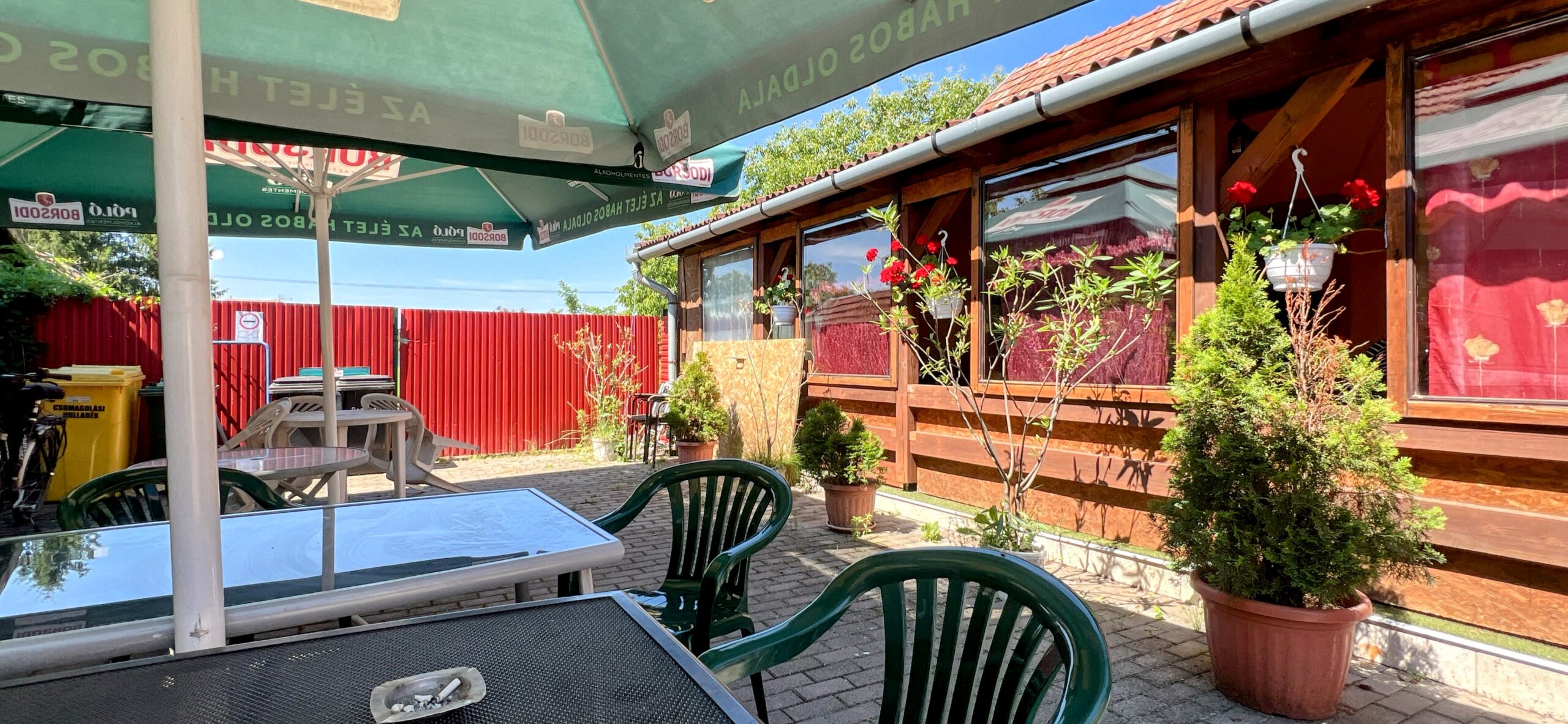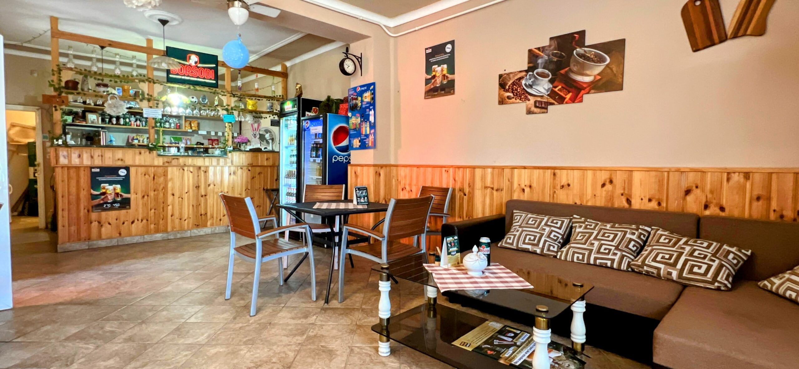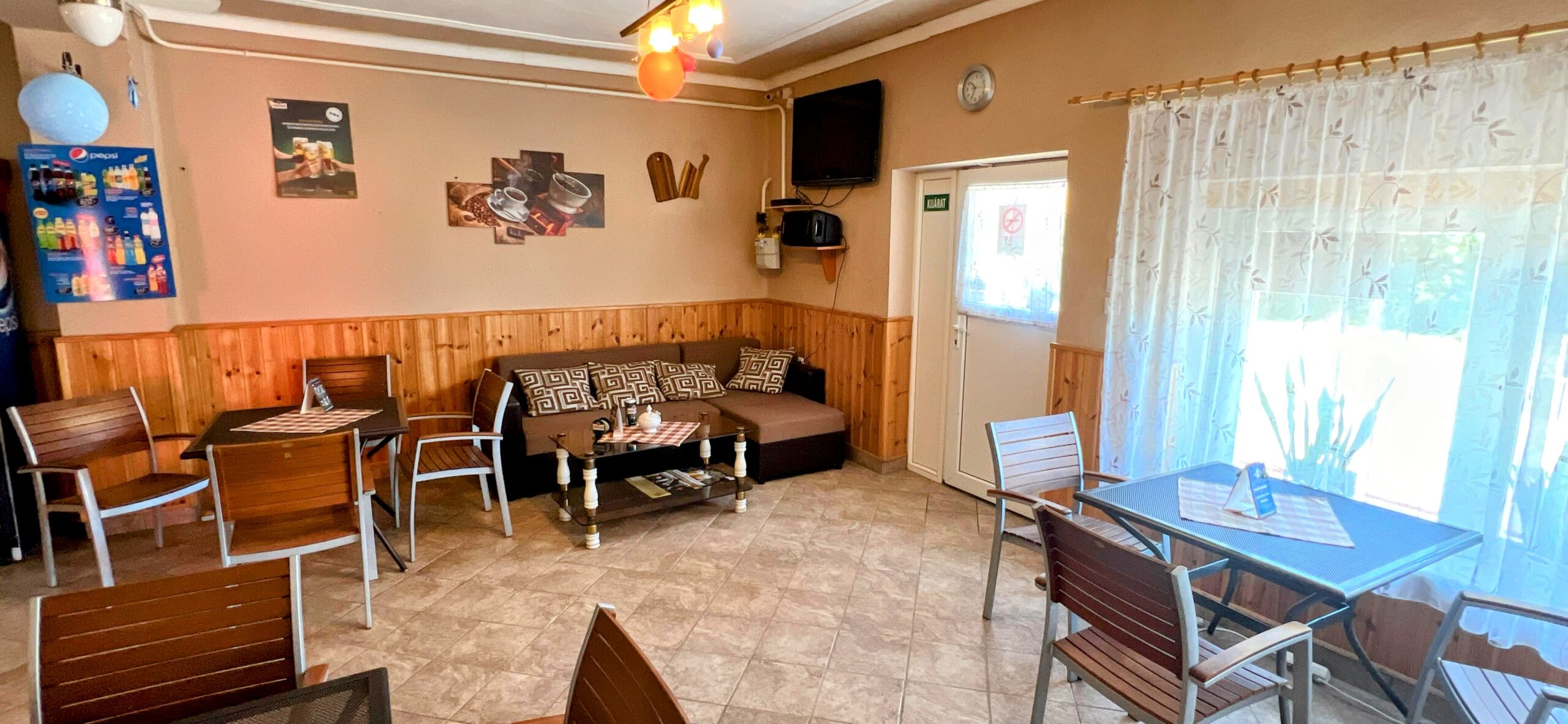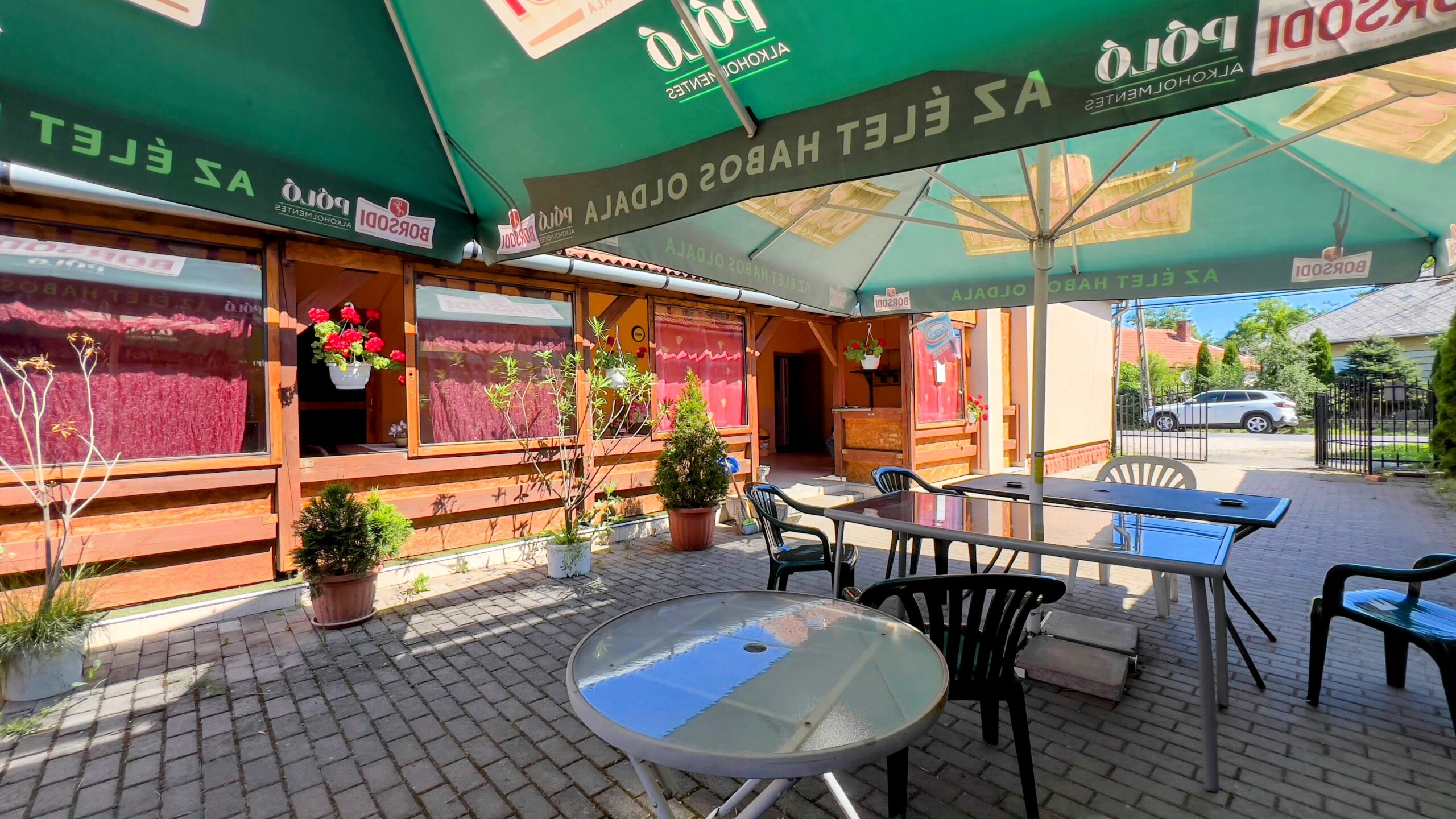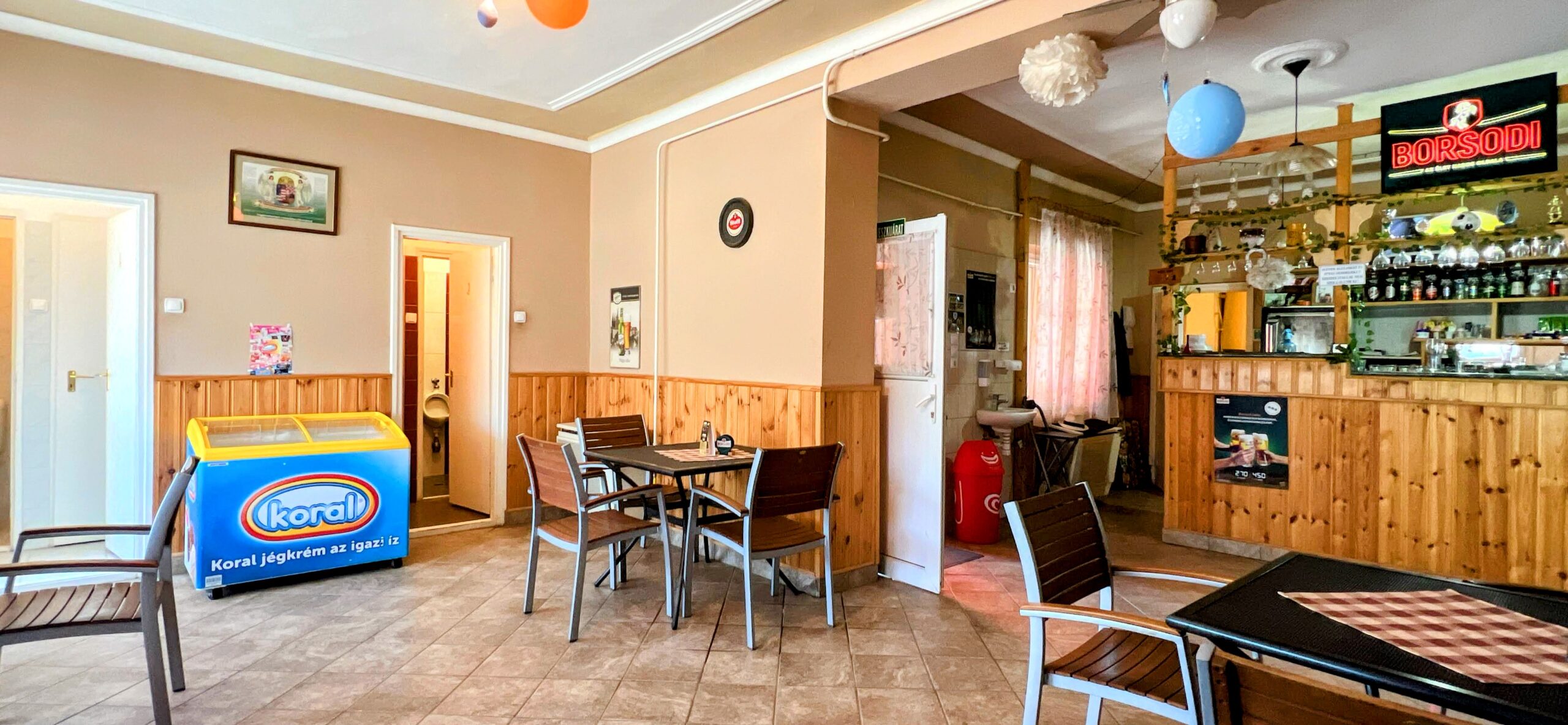 A cca. 100m2-es jó állapotú vendéglátóegységben vendégtér, pult, raktár, női-férfi toalettek, pihenőterasz és a hátsó traktusban egy élelmiszerbolt van kialakítva.