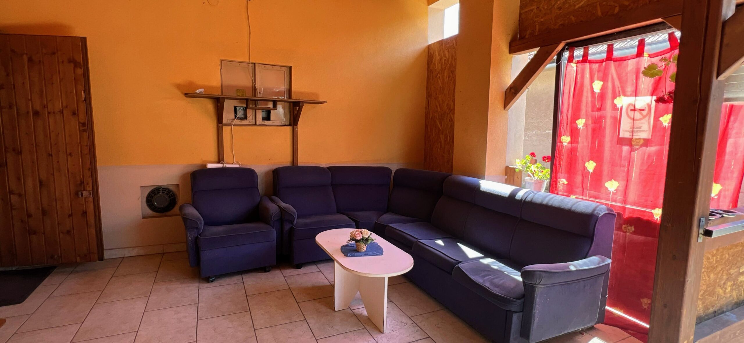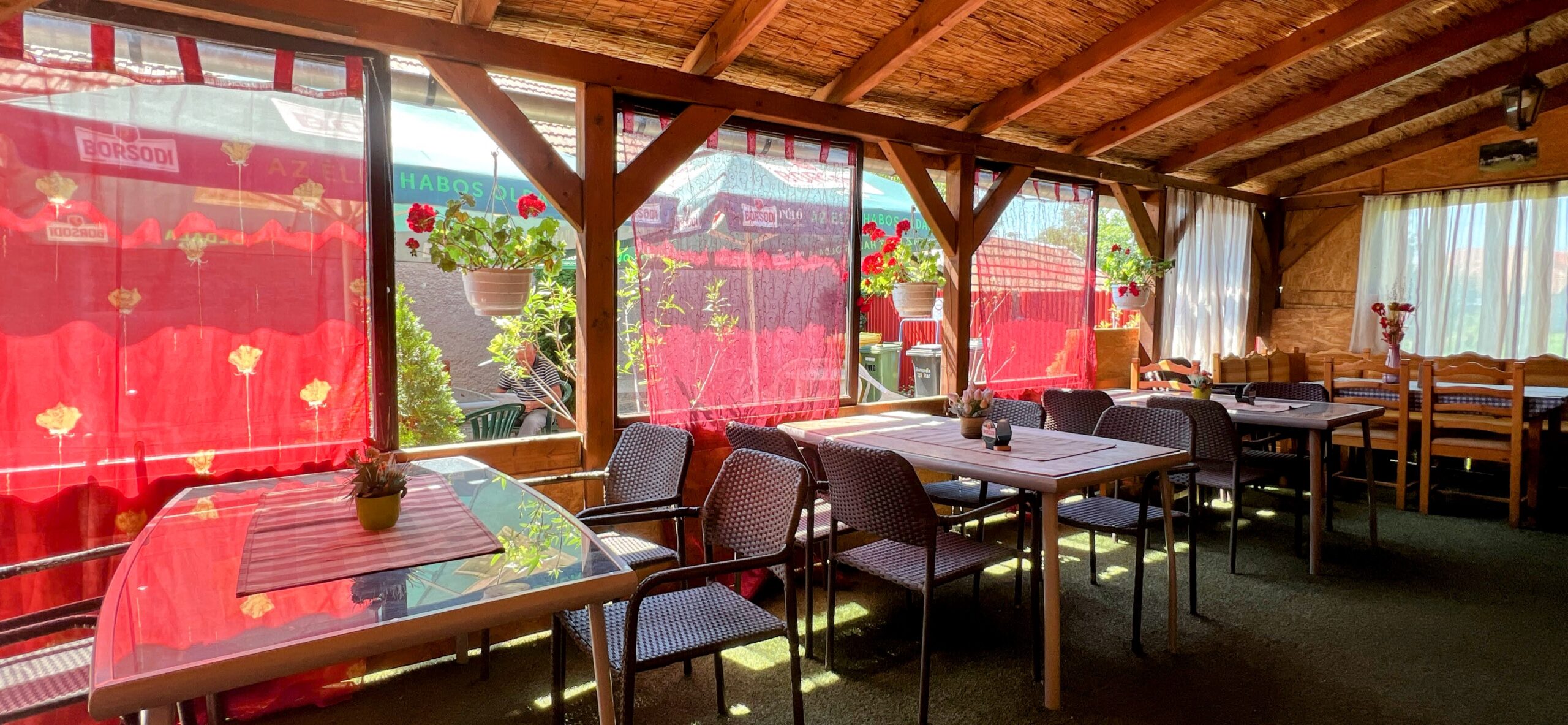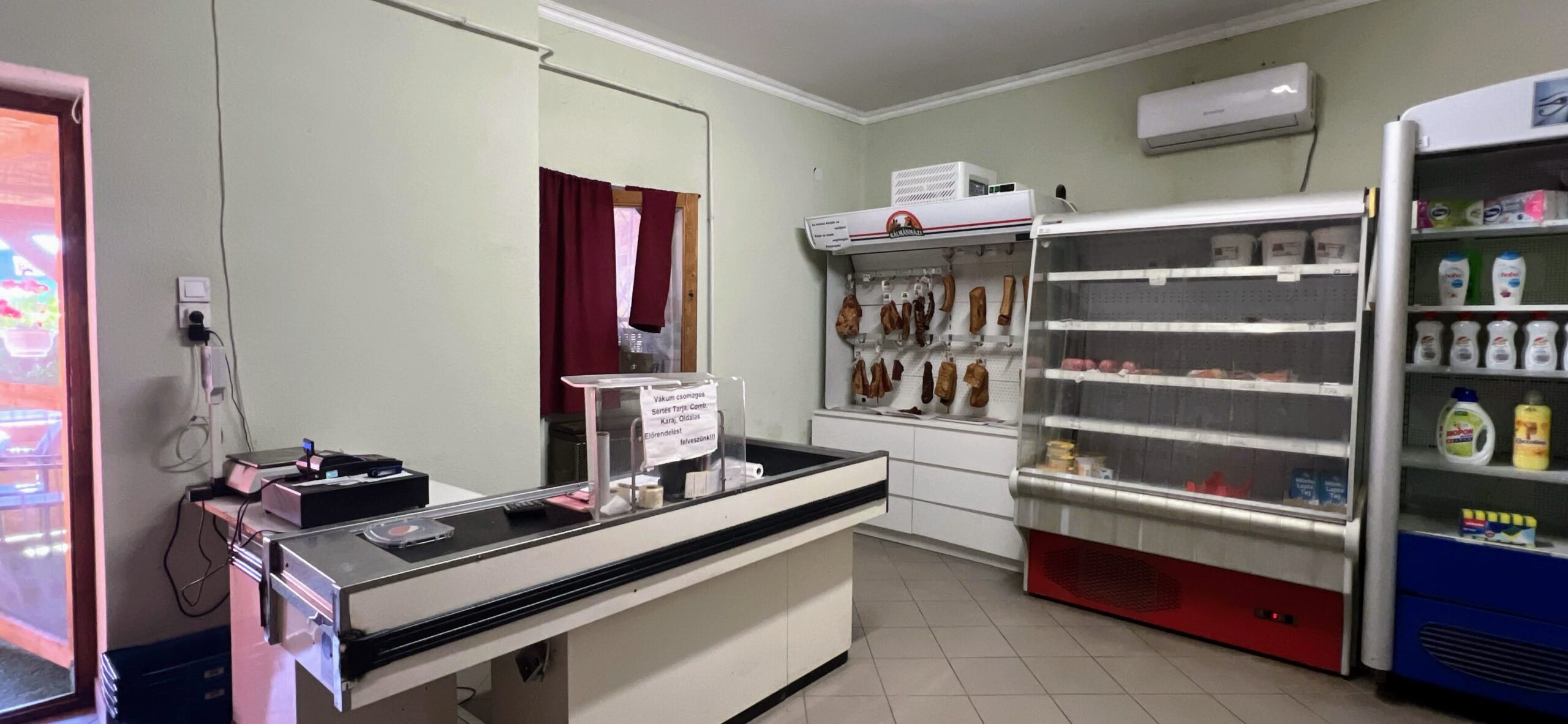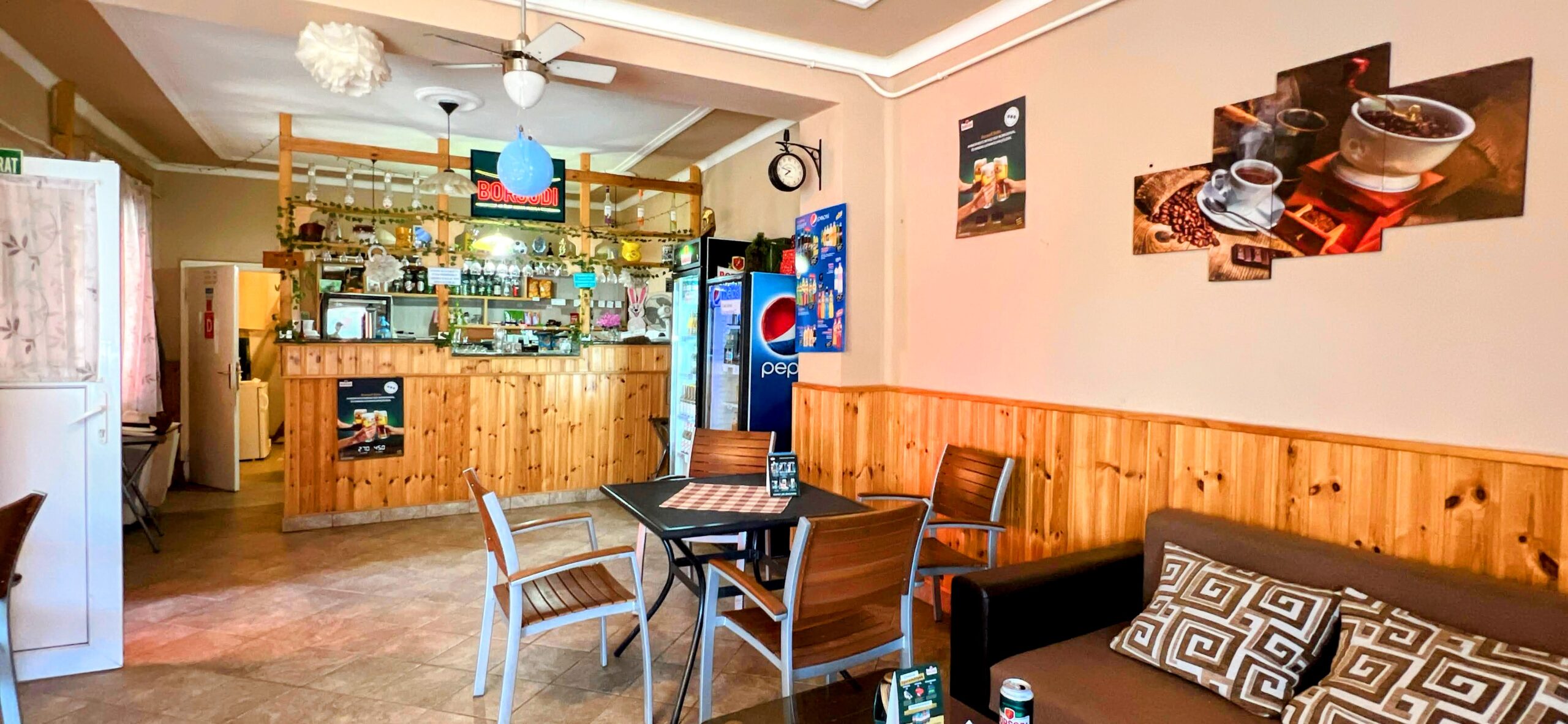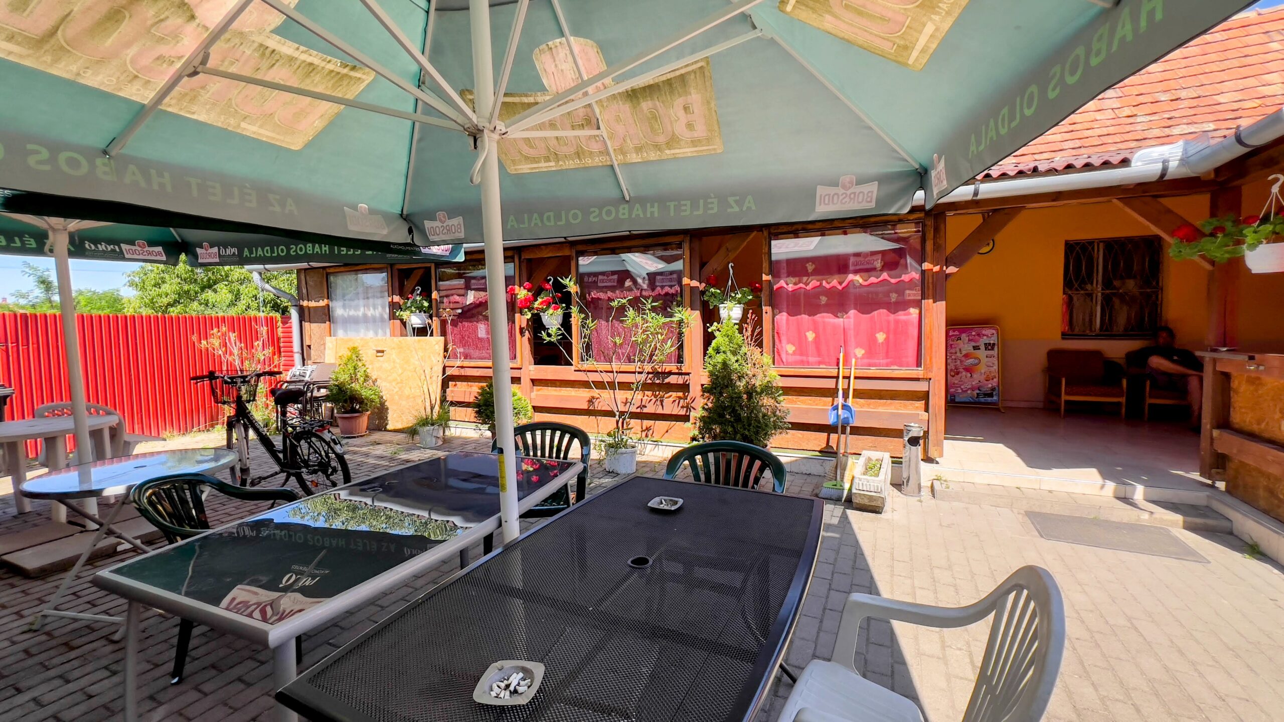 A cca. 100m2-es jó állapotú vendéglátóegységben vendégtér, pult, raktár, női-férfi toalettek, pihenőterasz és a hátsó traktusban egy élelmiszerbolt van kialakítva.